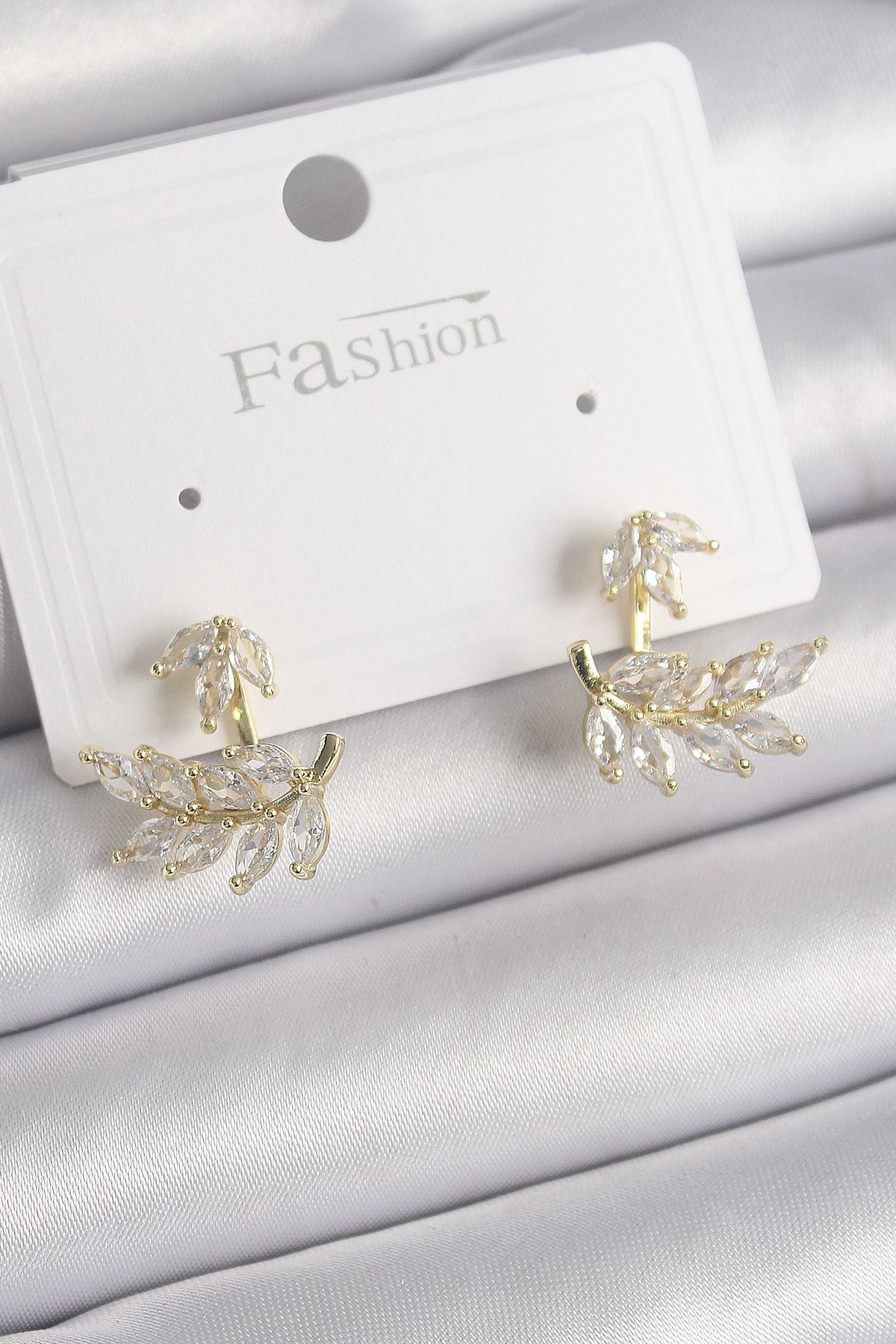 YRTCL Pirinç Gold Renk Zirkon Taşlı Yaprak Model Kadın Küpe