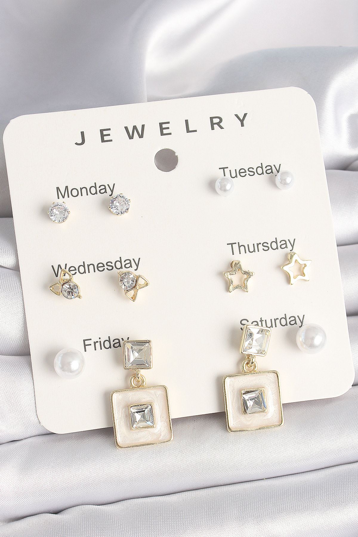 YRTCL Pirinç Gold Renk Zirkon Taşlı Yıldız Figür Sallantı Beyaz Mineli Model 7'Li Kadın Küpe Seti