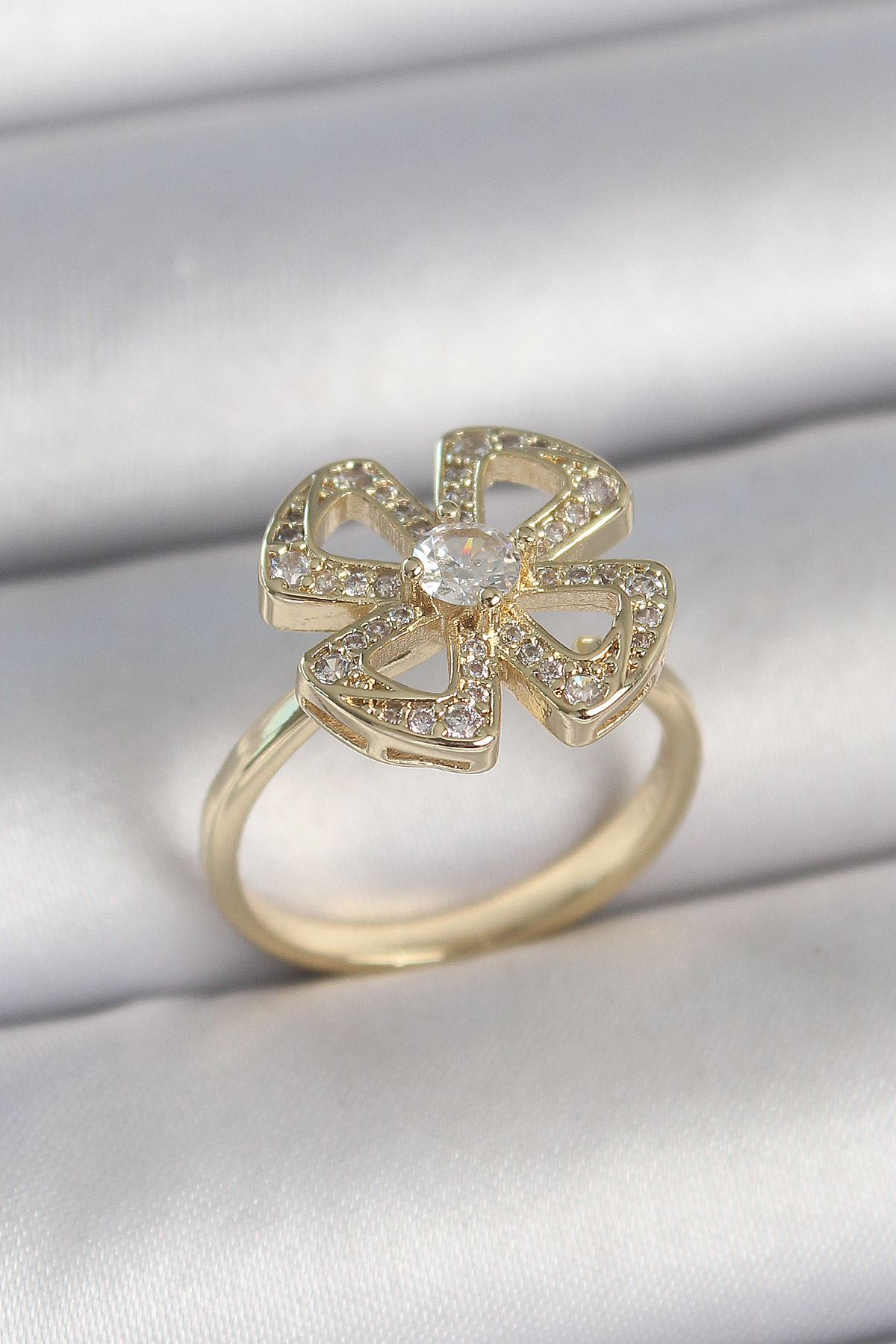 YRTCL Pirinç Gold Renk Zirkon Taşlı Yonca Model Ayarlanabilir Kadın Yüzük