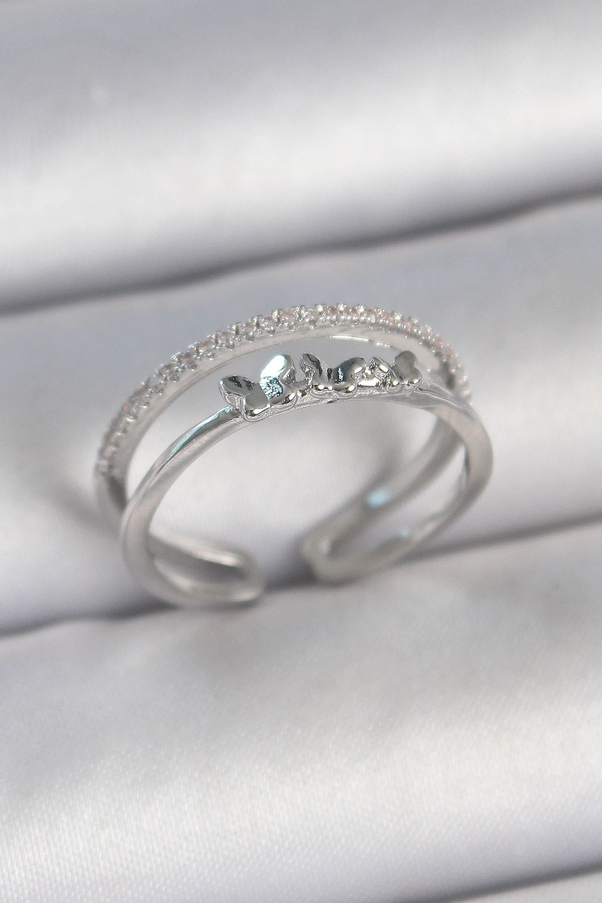 YRTCL Pirinç Gümüş Renk 2'Li Zirkon Taş Detaylı Kelebek Figür Ayarlanabilir Model Kadın Yüzük