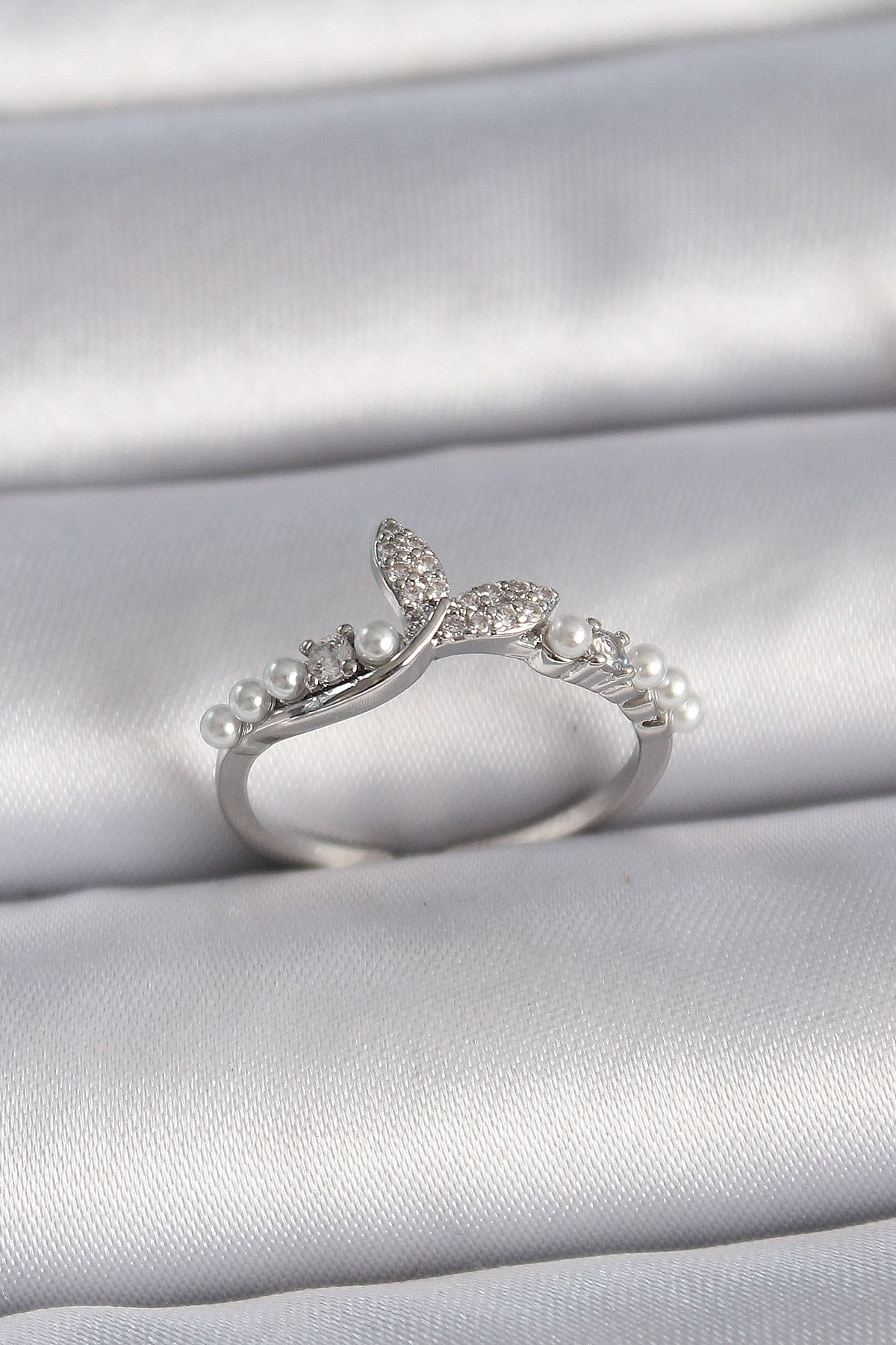 YRTCL Pirinç Gümüş Renk Ayarlanabilir Zirkon Taşlı Balık Kuyruğu İnci Detay Model Kadın Yüzük