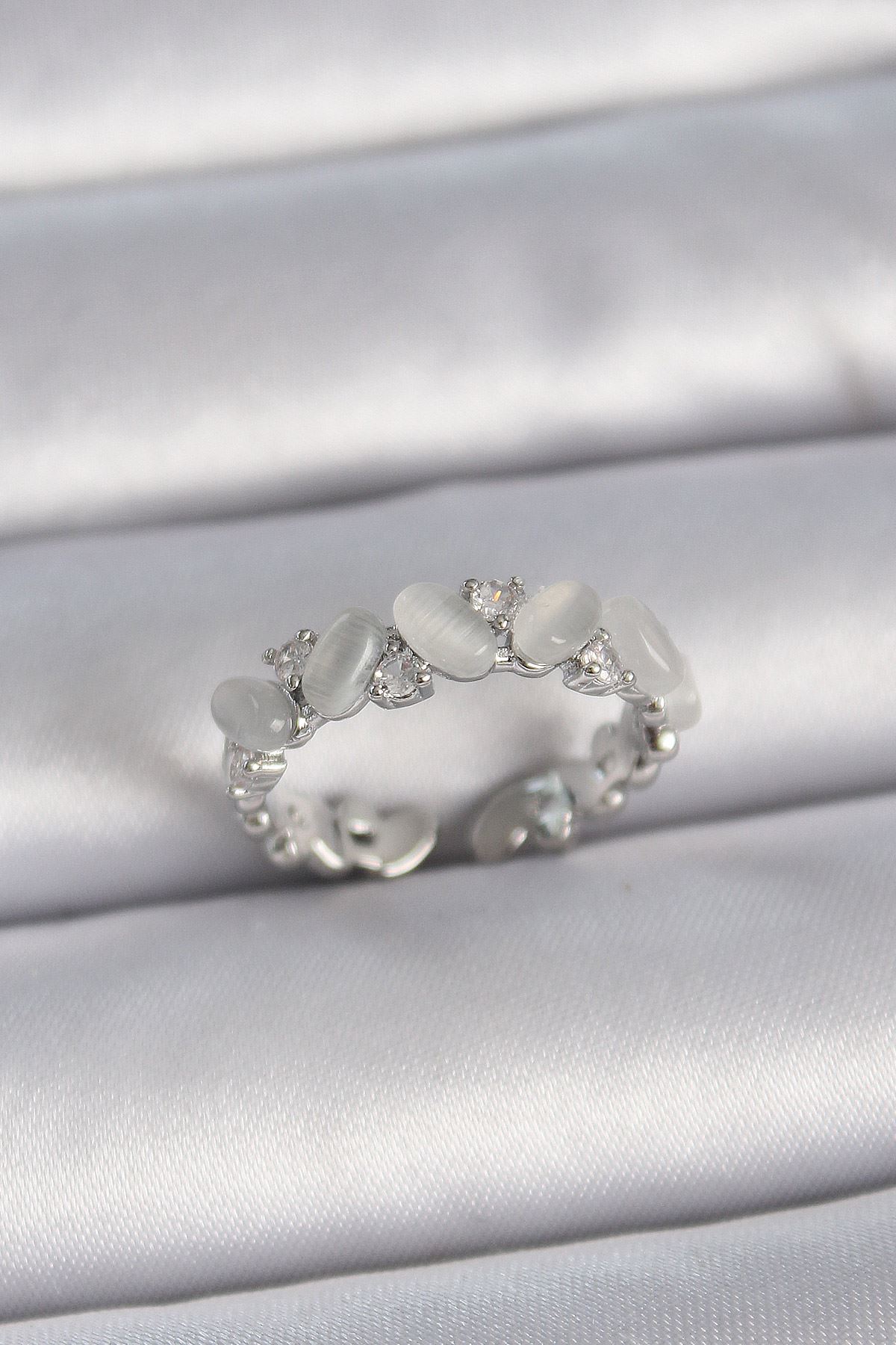 YRTCL Pirinç Gümüş Renk Ayarlanabilir Zirkon Taşlı Beyaz Mineli Model Kadın Yüzük