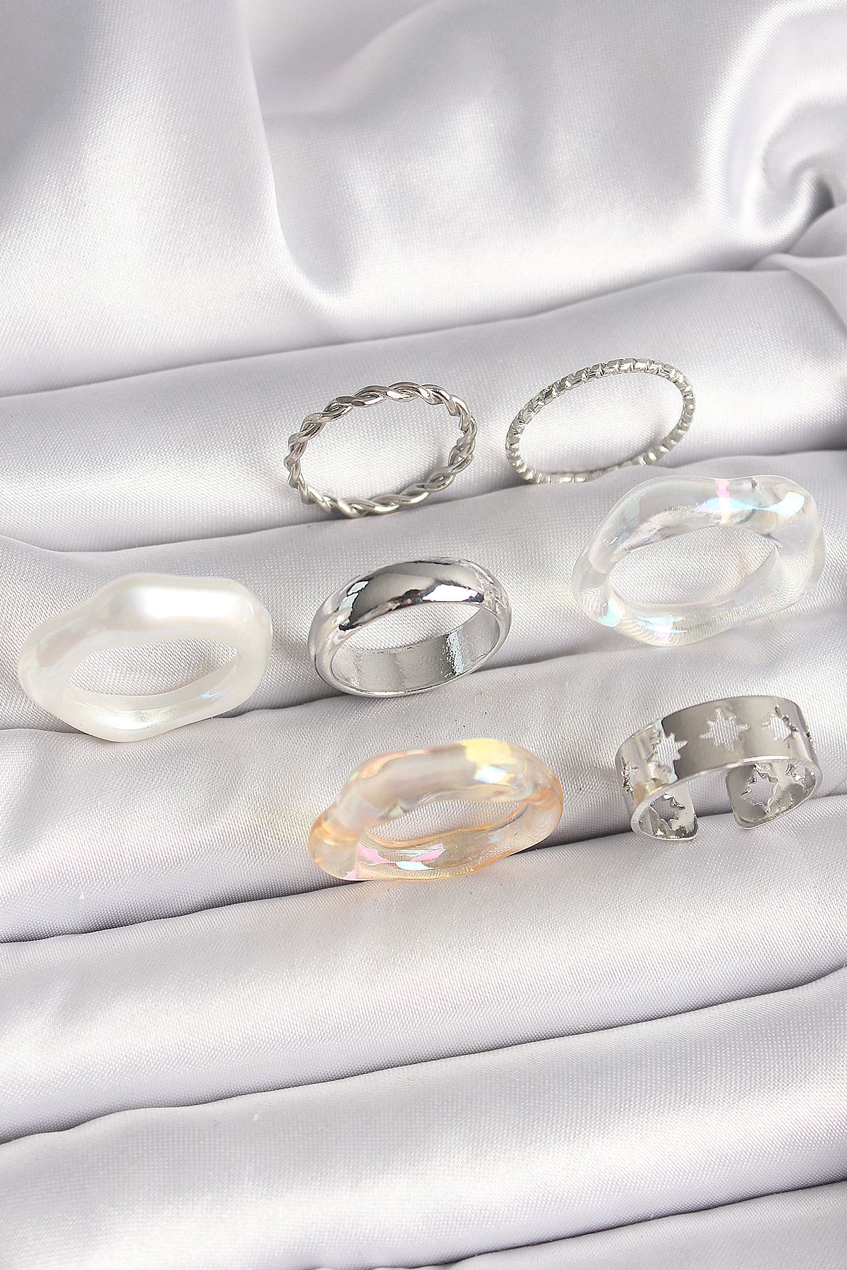YRTCL Pirinç Gümüş Renk Beyaz Akrilik Plastik Model Kutup Yıldız İşleme Detaylı Kadın Yüzük Kombini