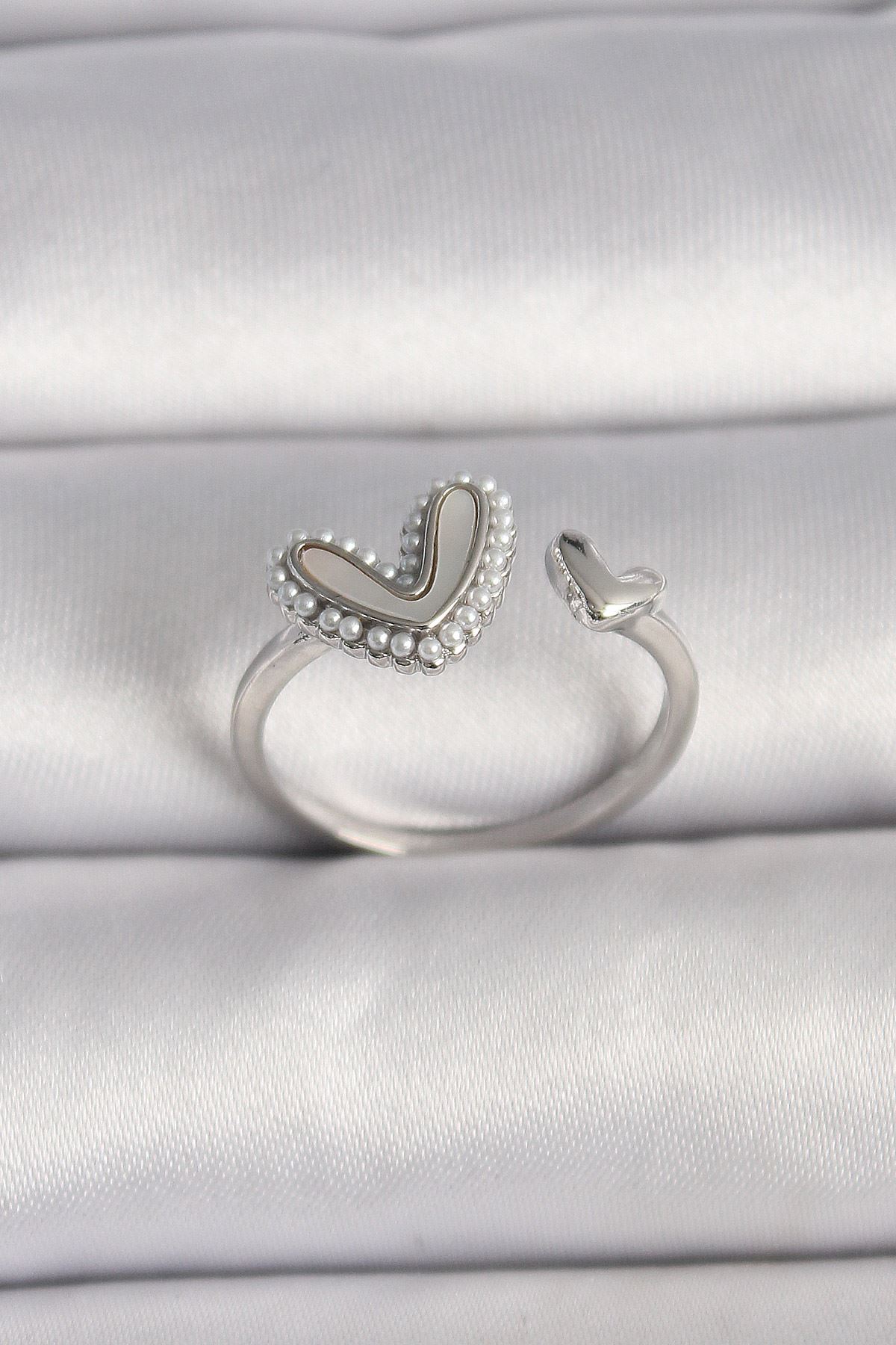 YRTCL Pirinç Gümüş Renk Beyaz Mineli İnci Detaylı Kalp Model Ayarlanabilir Yüzük