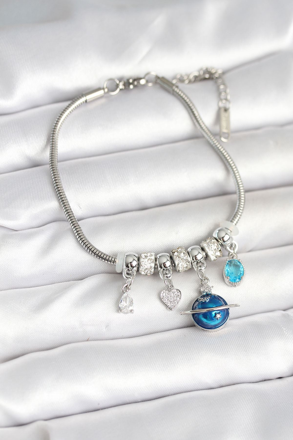 YRTCL Pirinç Gümüş Renk Dünya Charmlı Kadın Bileklik