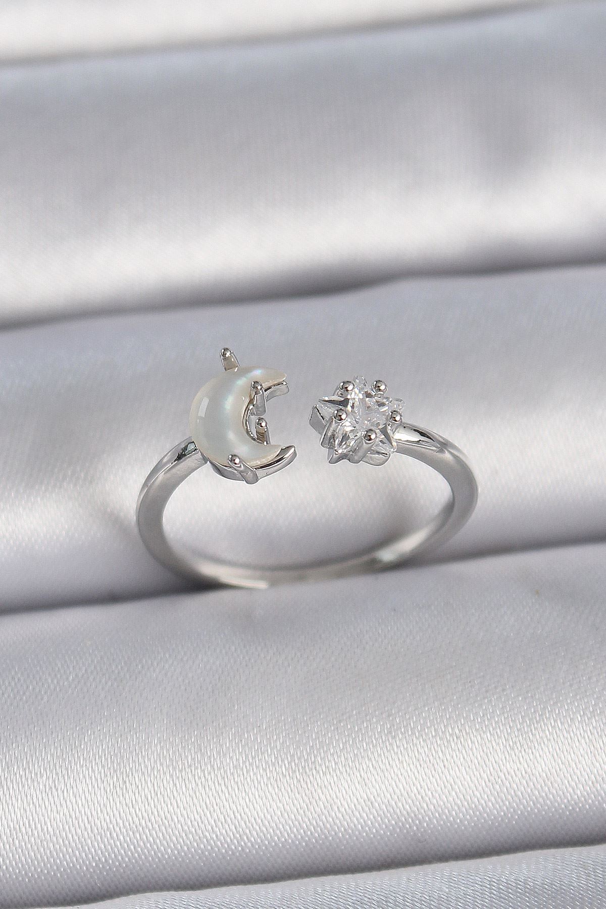 YRTCL Pirinç Gümüş Renk İncili Hilal Zirkon Taşlı Yıldız Ayarlanabilir Kadın Yüzük