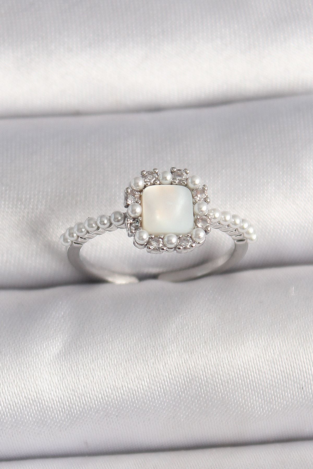 YRTCL Pirinç Gümüş Renk İncili Kare Beyaz Mineli Ayarlanabilir Kadın Yüzük