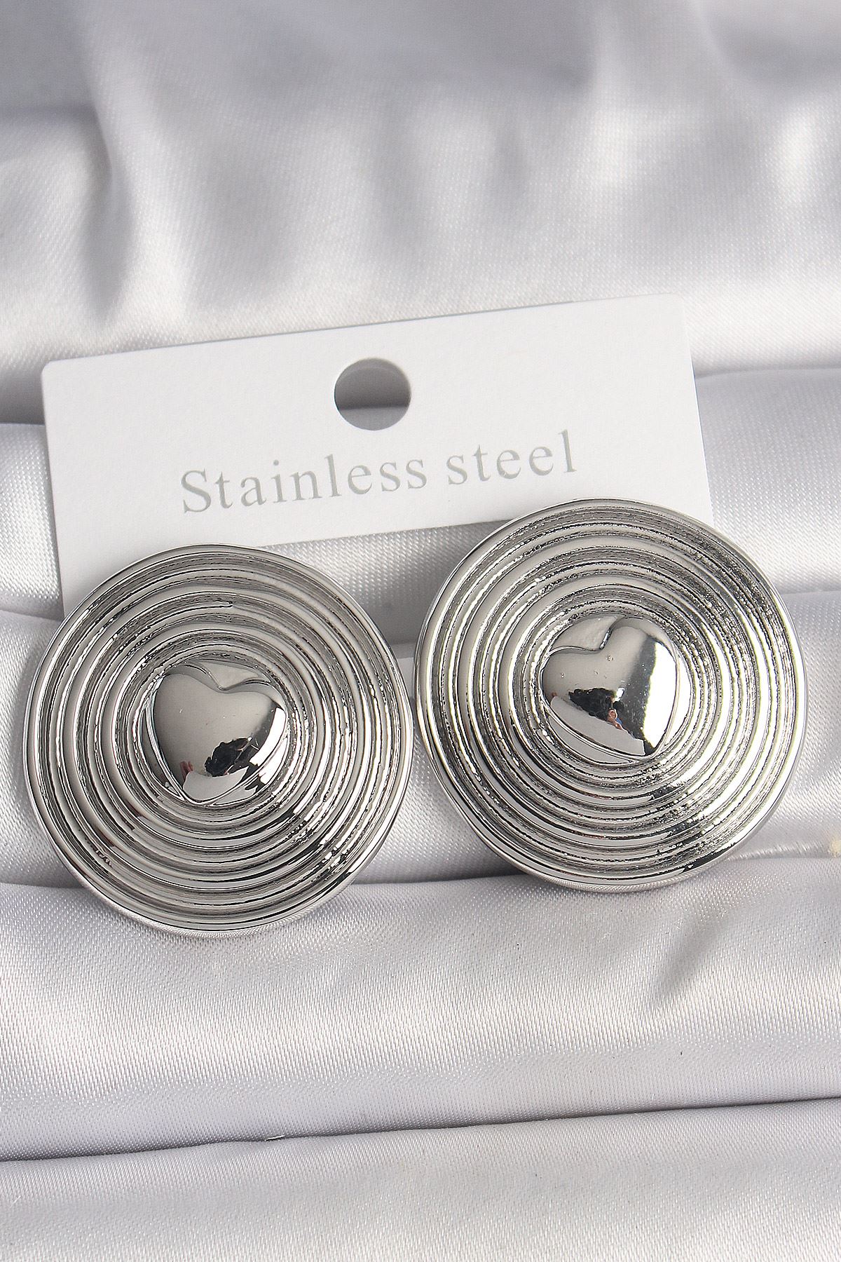 YRTCL Pirinç Gümüş Renk Kalp İşlemeli Daire Plaka Model Kadın Küpe