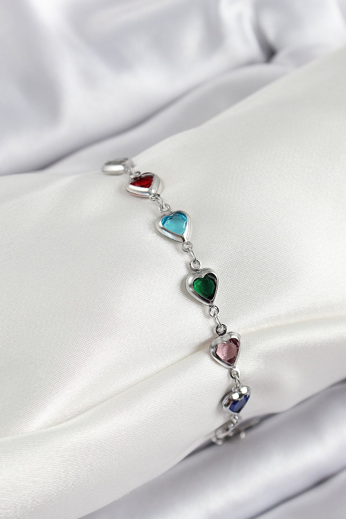 YRTCL Pirinç Gümüş Renk Karışık Renk Kalp Zirkon Taşlı Kadın Bileklik