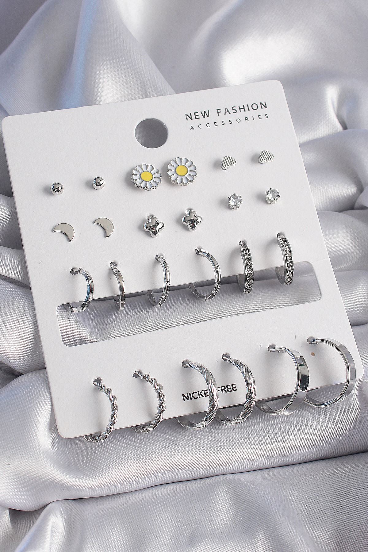 YRTCL Pirinç Gümüş Renk Papatya Detaylı 12 Çiftli Kadın Küpe Seti