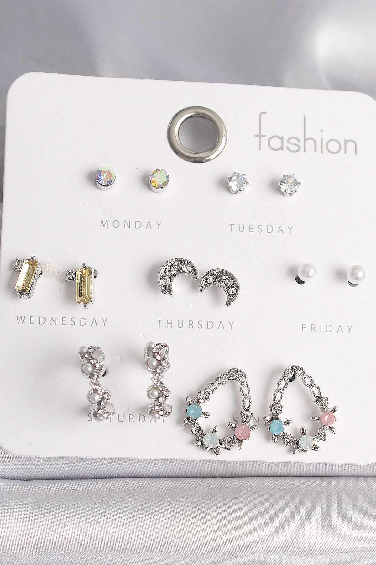 YRTCL Pirinç Gümüş Renk Renkli Zirkon Taşlı Halka Damla Figür Hilal Detay 7 Çift Kadın Küpe Seti