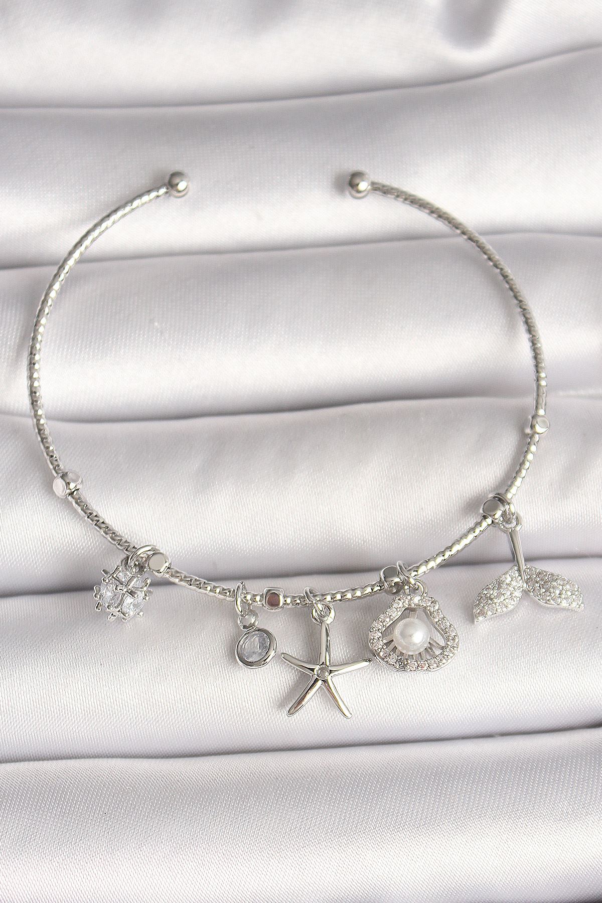 YRTCL Pirinç Gümüş Renk Sallantı Zirkon Taşlı Deniz Yıldız Figür Balık Kuyruğu Detay Charm Kadın Bileklik