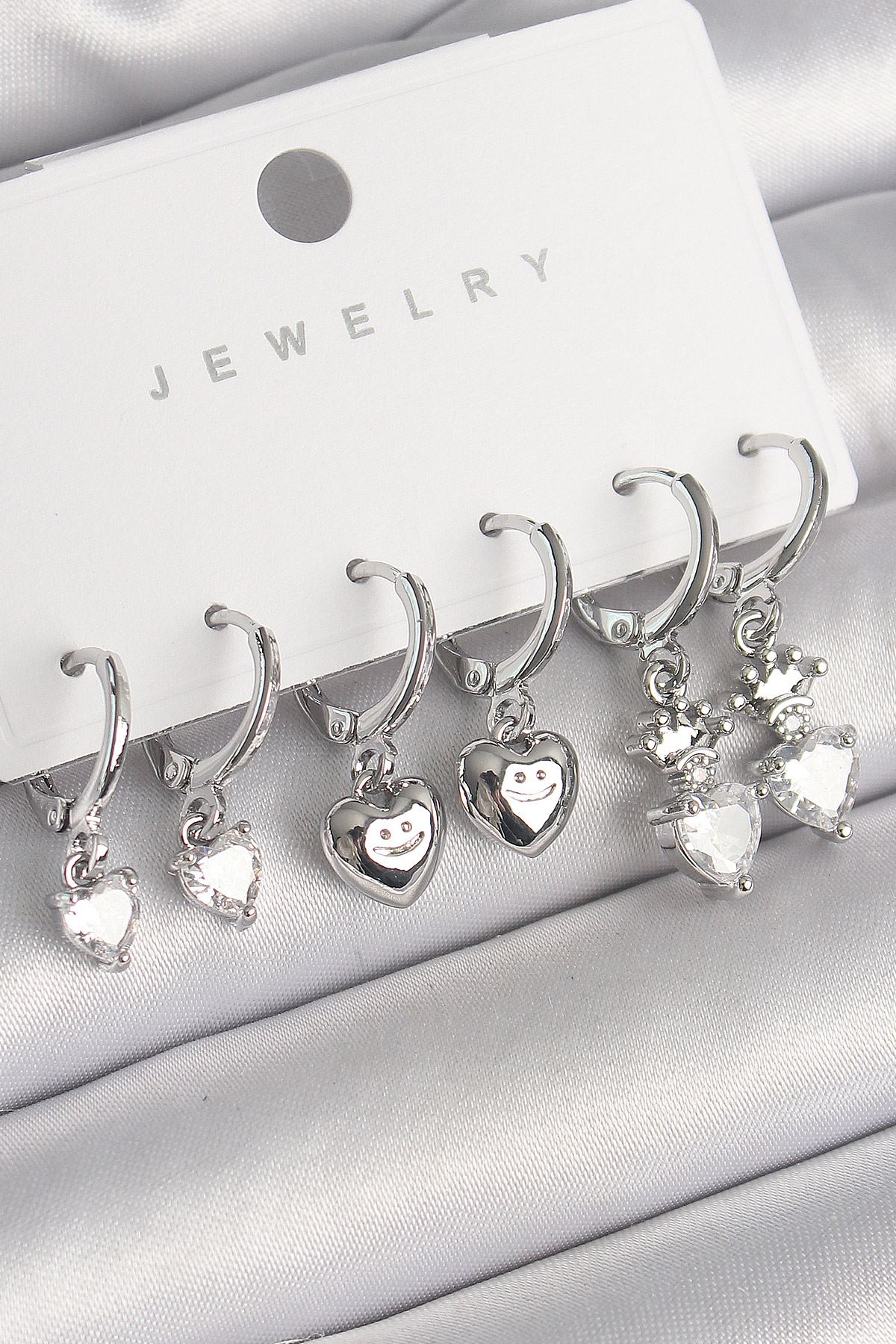 YRTCL Pirinç Gümüş Renk Sallantı Zirkon Taşlı Kalp Model Taç Detay Kadın Küpe Seti