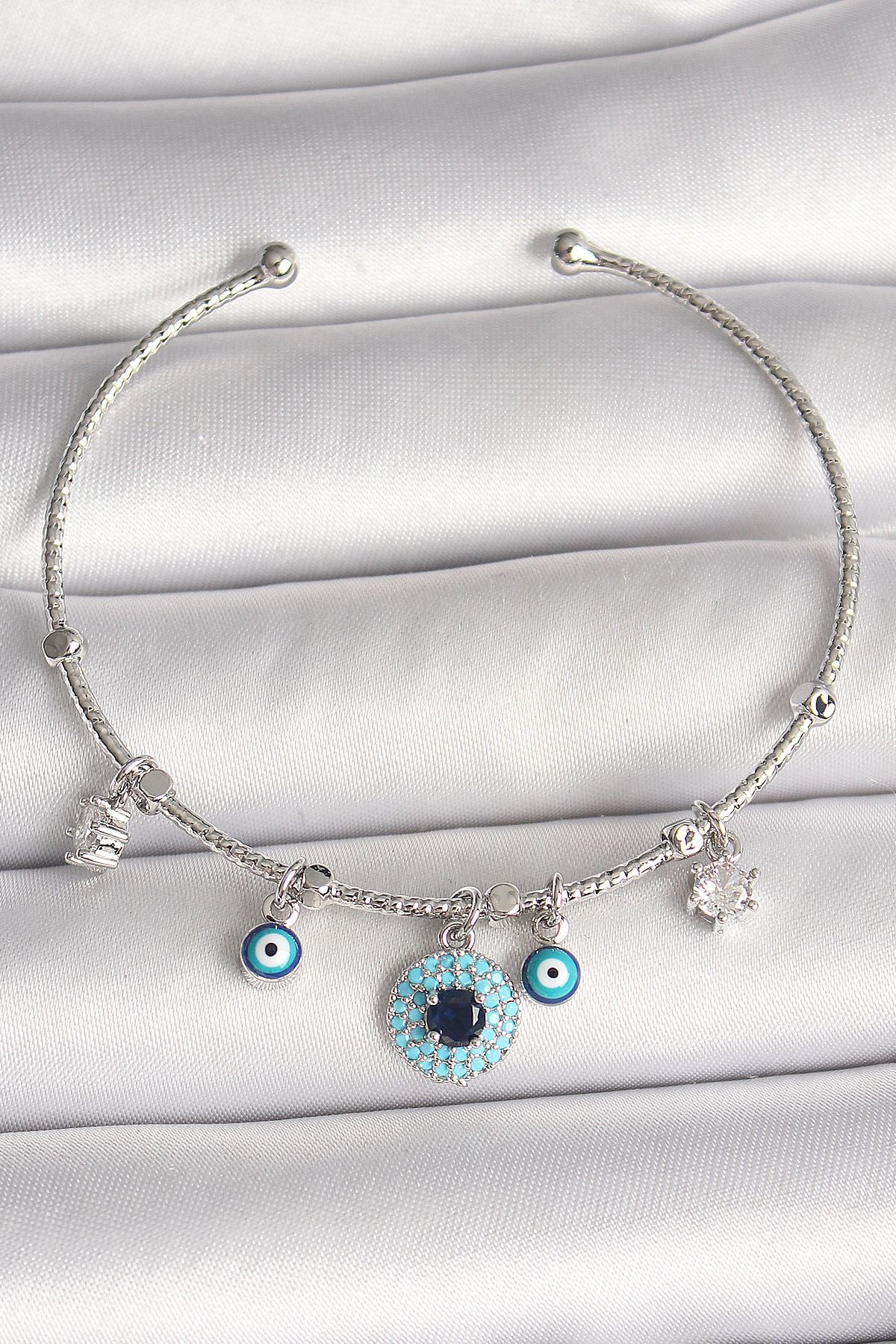 YRTCL Pirinç Gümüş Renk Sallantı Zirkon Taşlı Nazar Boncuk Figür Charm Kadın Bileklik