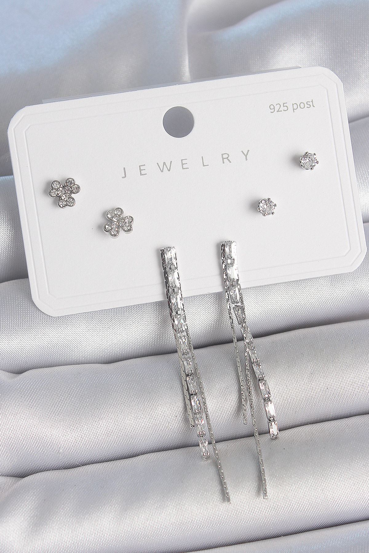 YRTCL Pirinç Gümüş Renk Su Yolu Zirkon Taşlı Sallantı Model Çiçek Detay 925 Ayar Gümüş Çivi Kadın Küpe Seti
