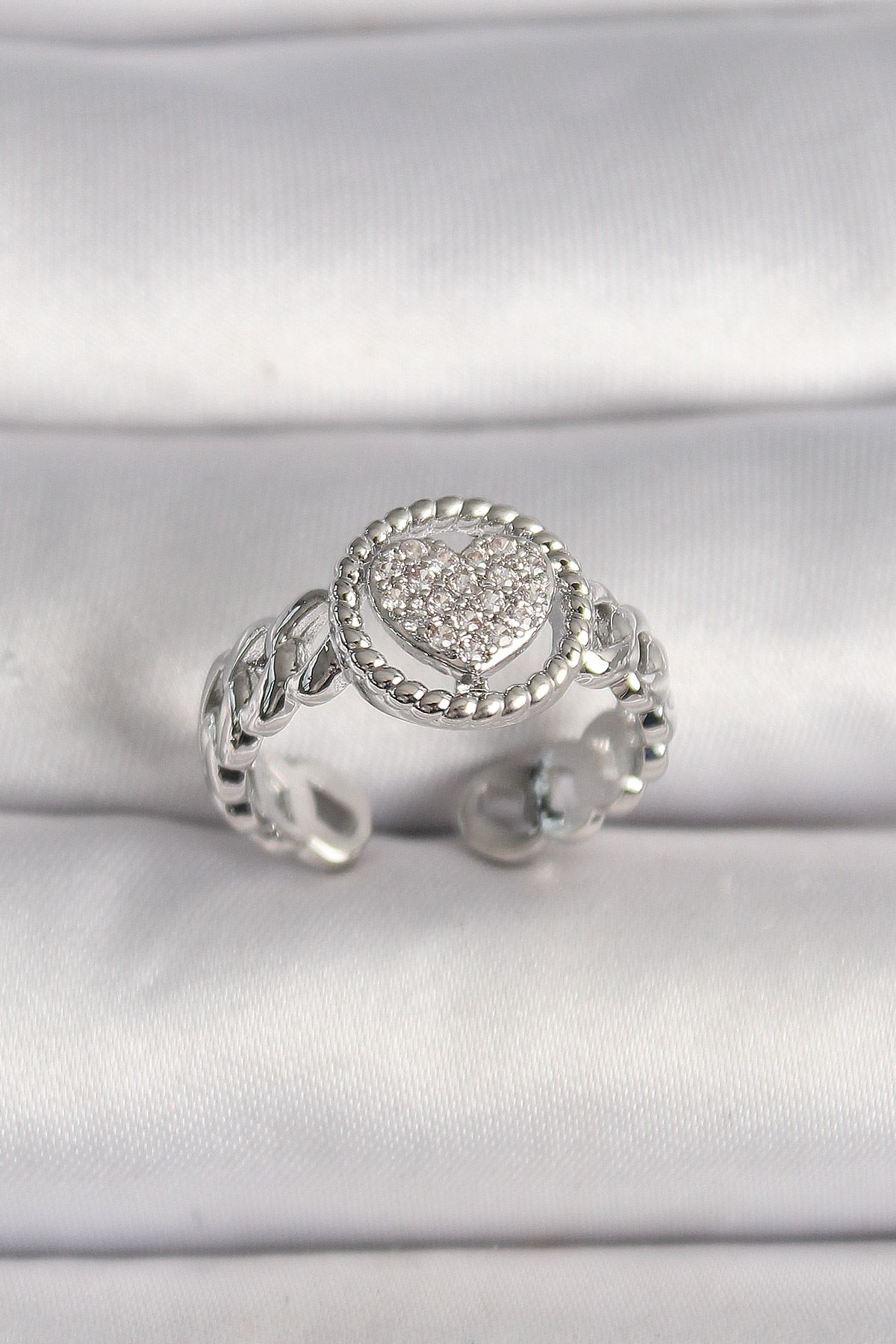 YRTCL Pirinç Gümüş Renk Zirkon Taşlı Kalpli Su Yolu Model Ayarlanabilir Yüzük