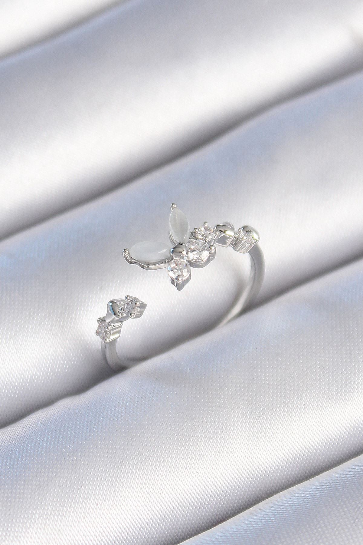 YRTCL Pirinç Gümüş Renk Zirkon Taş Detaylı Beyaz Mineli Kelebek Model Kadın Yüzük