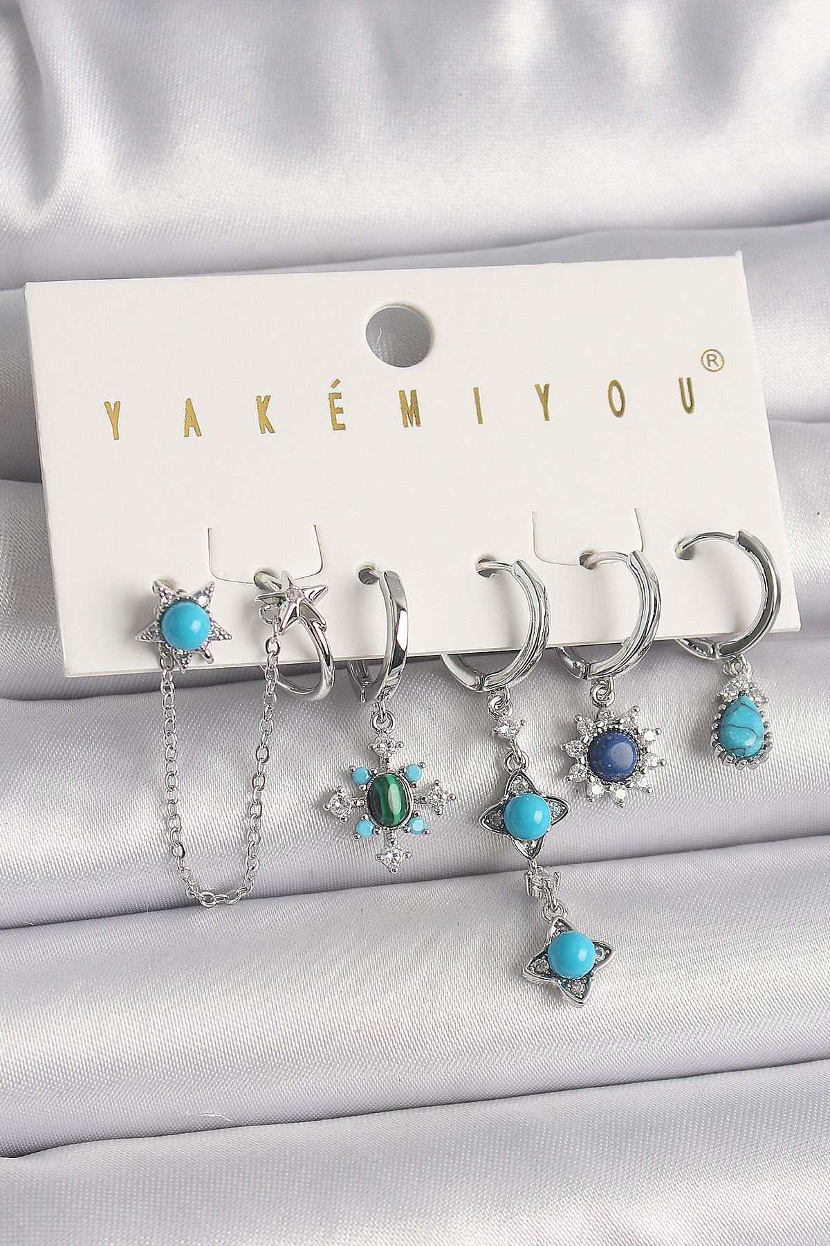 YRTCL Pirinç Gümüş Renk Zirkon Taş Detaylı Mavi Boncuklu Çiçek Model VIP Seri Kadın Küpe Kombini