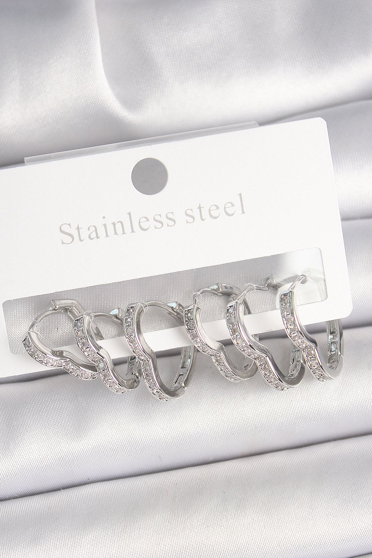 YRTCL Pirinç Gümüş Renk Zirkon Taşlı 3 Çift Kalp Model Kadın Küpe