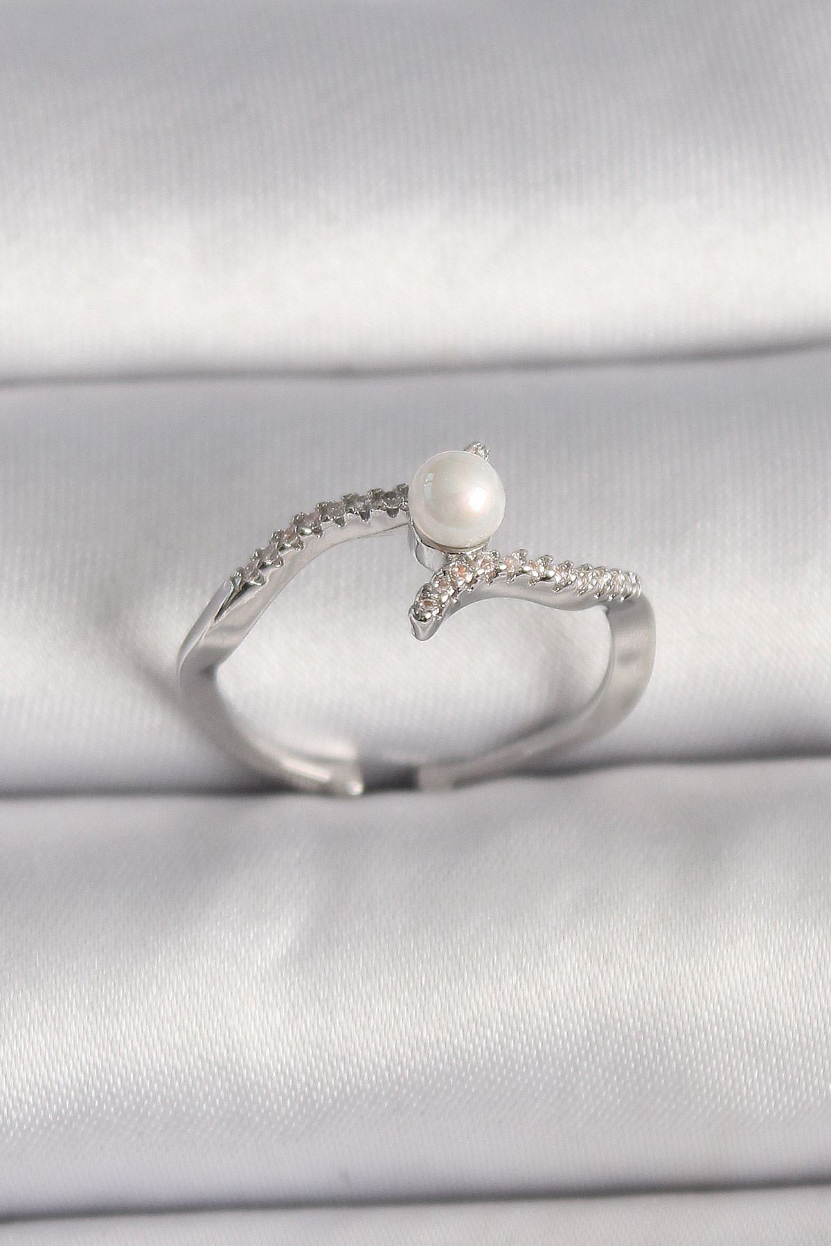 YRTCL Pirinç Gümüş Renk Zirkon Taşlı Kurdele Model İnci Detay Kadın Yüzük