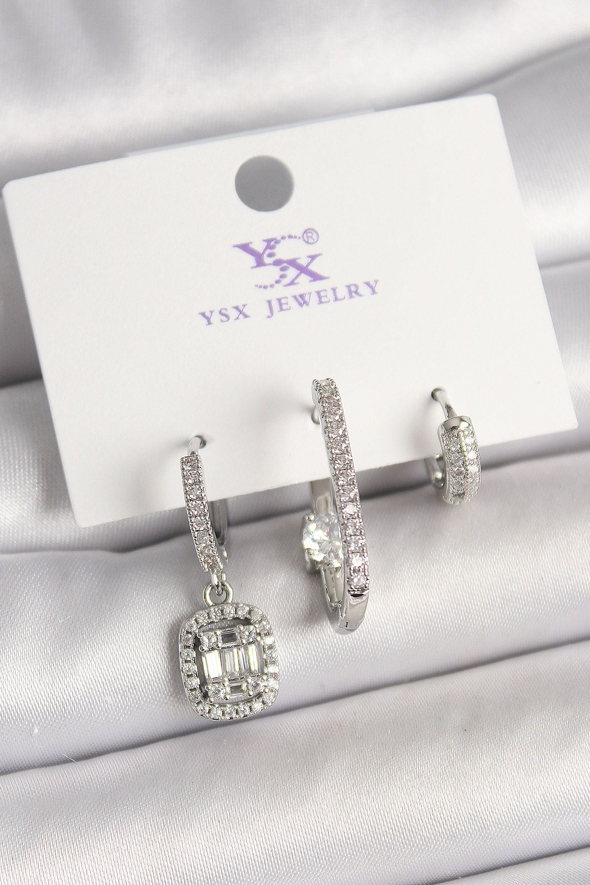 YRTCL Pirinç Gümüş Renk Zirkon Taşlı Baget Halka Model 3'Lü Kadın Kombin Küpe