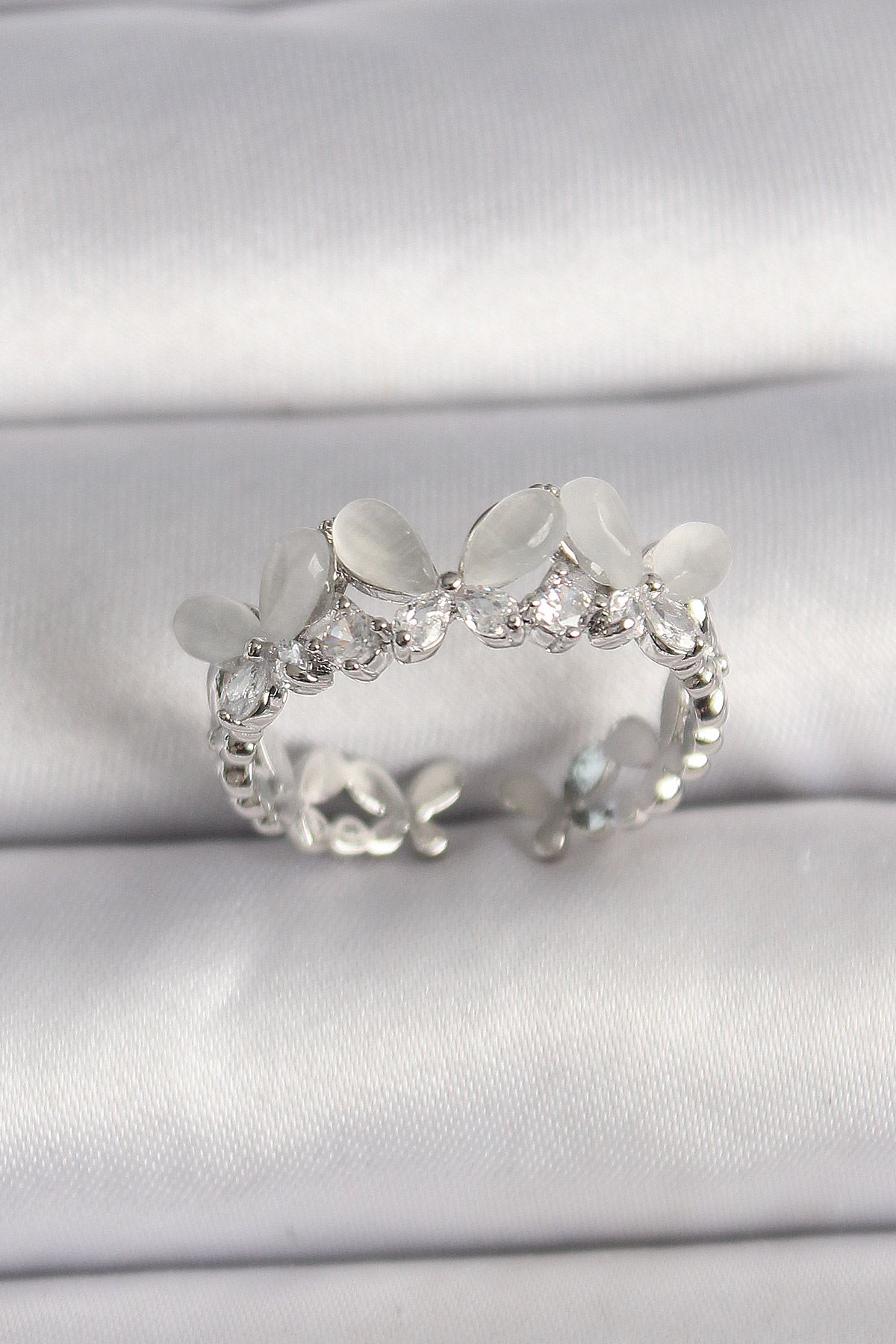 YRTCL Pirinç Gümüş Renk Zirkon Taşlı Beyaz Mineli Kelebek Model Ayarlanabilir Yüzük