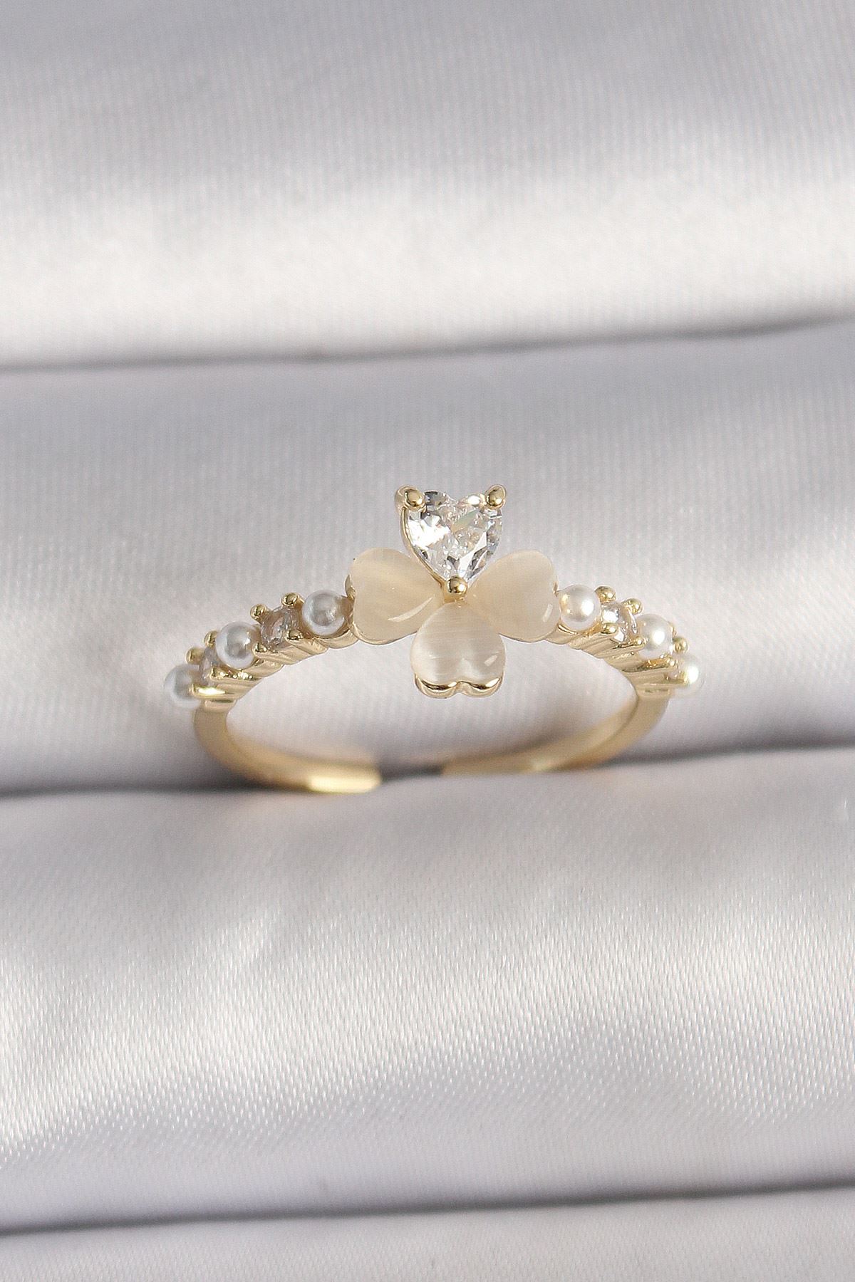 YRTCL Pirinç Gümüş Renk Zirkon Taşlı Beyaz Mineli Yonca Model İnci Detay Ayarlanabilir Yüzük