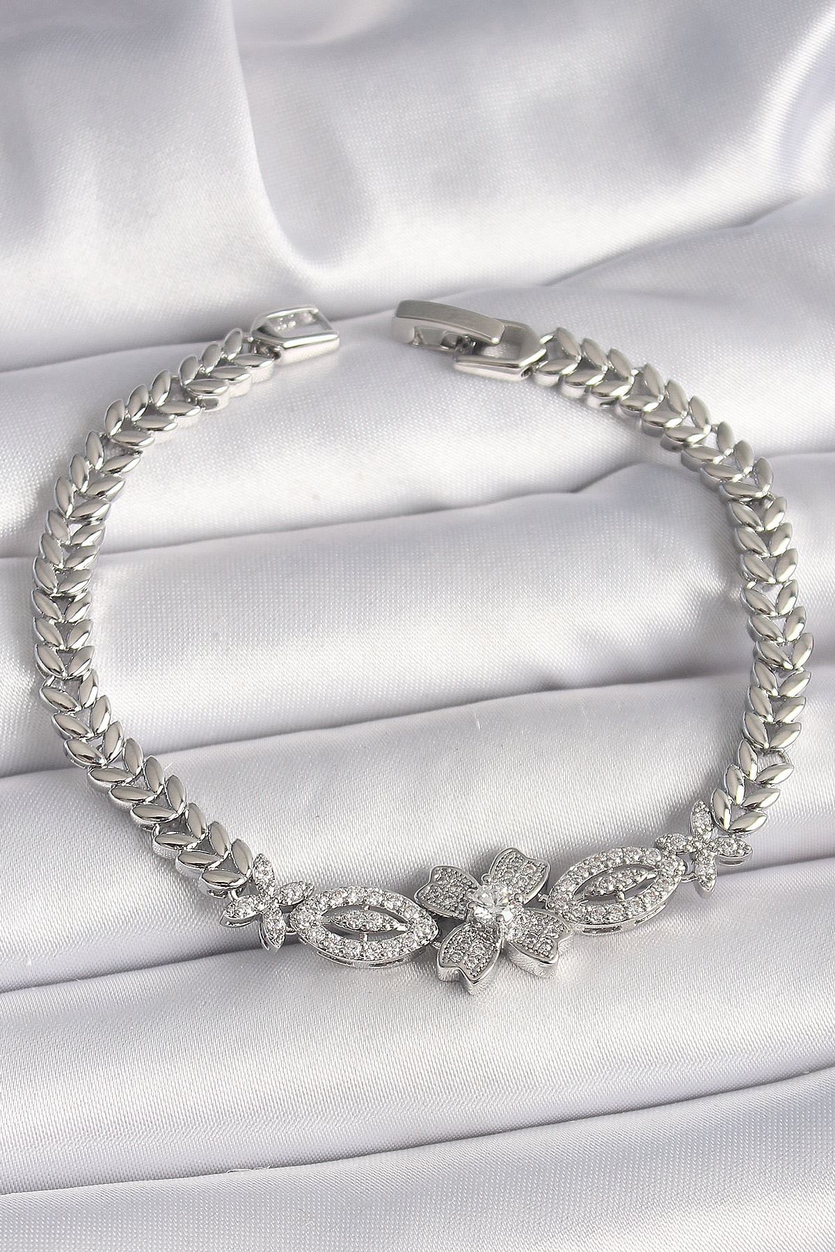 YRTCL Pirinç Gümüş Renk Zirkon Taşlı Çiçek Figür Arpa Zincir Model Kadın Bileklik