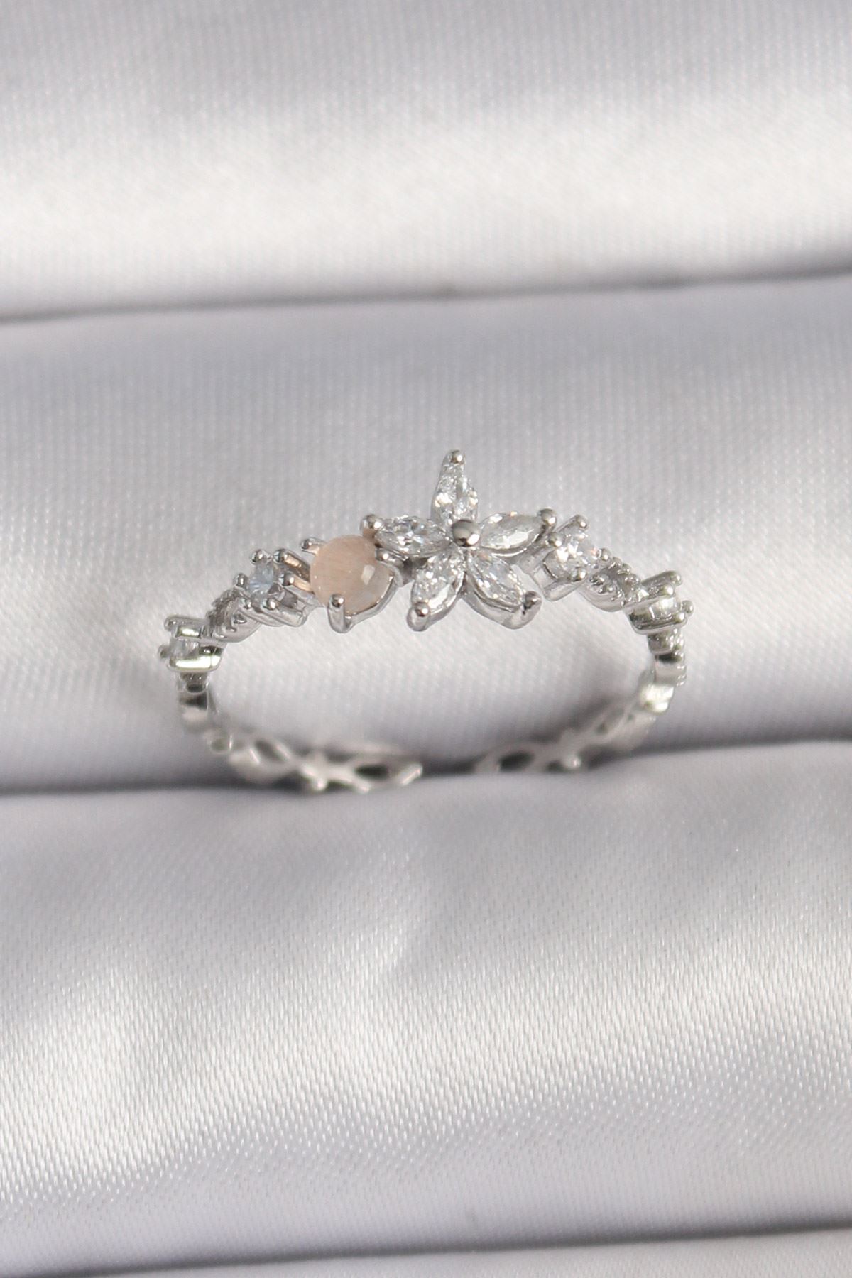YRTCL Pirinç Gümüş Renk Zirkon Taşlı Çiçek Model İnci Detay Ayarlanabilir Kadın Yüzük
