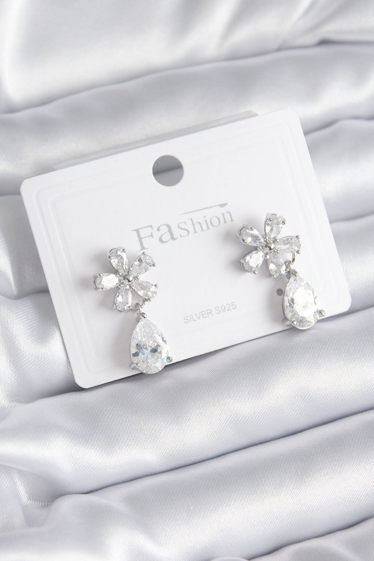YRTCL Pirinç Gümüş Renk Zirkon Taşlı Çiçek Model Damla Model Kadın Küpe