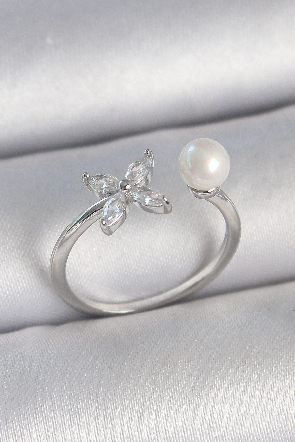 YRTCL Pirinç Gümüş Renk Zirkon Taşlı Çiçek Model İnci Detay Ayarlanabilir Kadın Yüzük