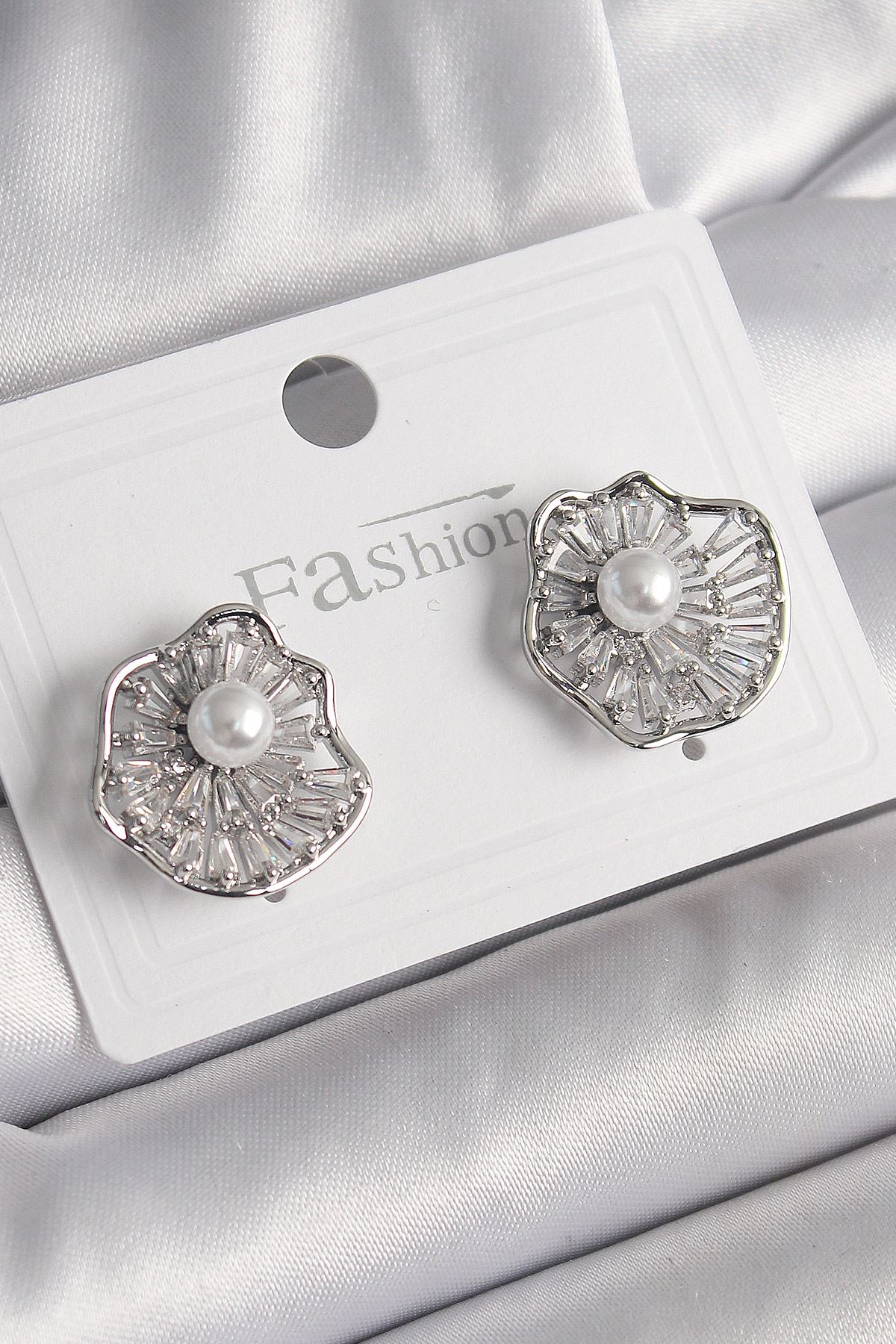 YRTCL Pirinç Gümüş Renk Zirkon Taşlı Çiçek Model İnci Detay Kadın Küpe