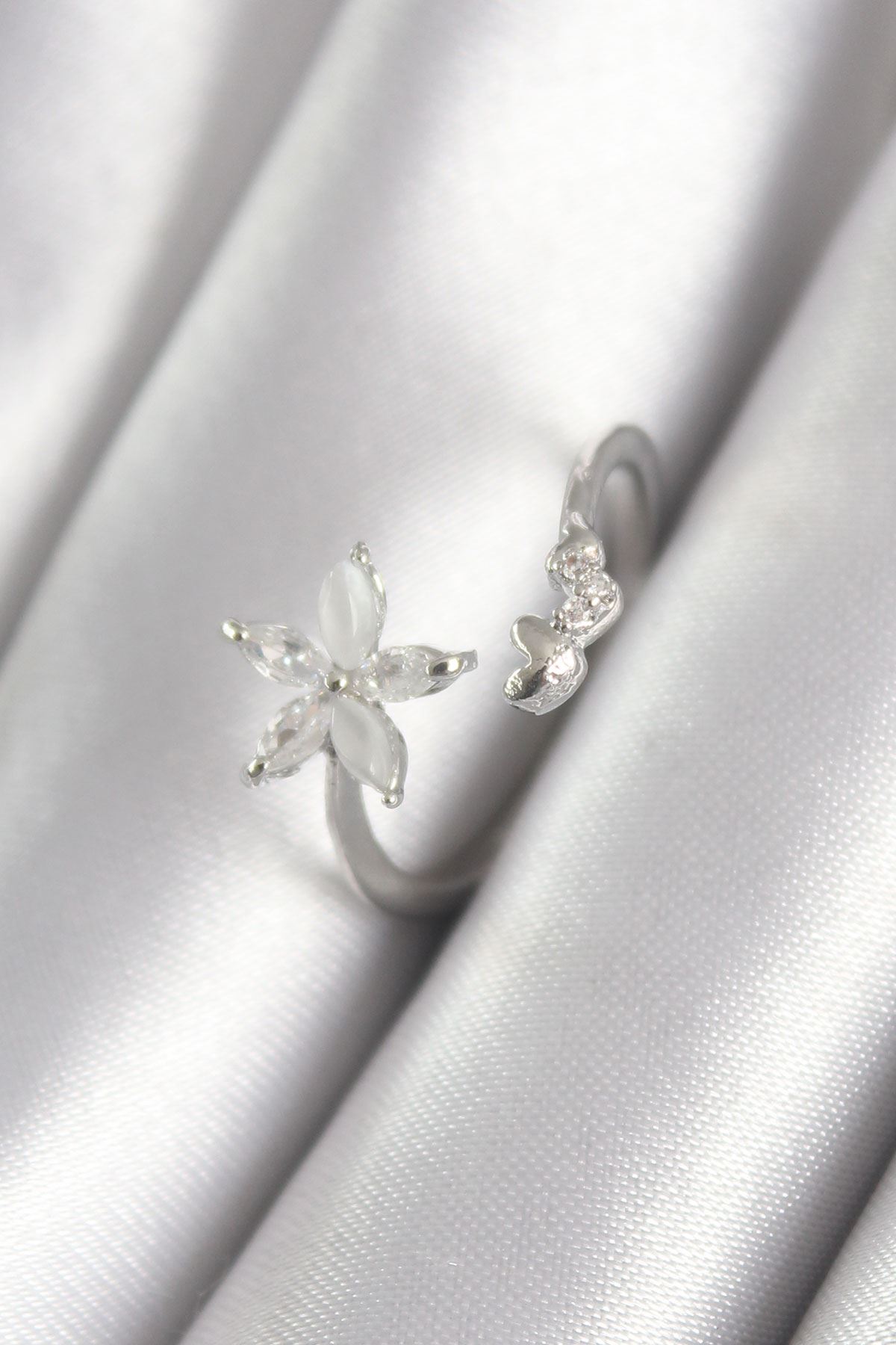 YRTCL Pirinç Gümüş Renk Zirkon Taşlı Çiçek Model Kalp Detay Kadın Yüzük