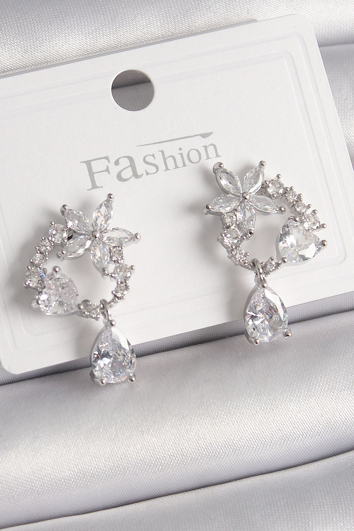 YRTCL Pirinç Gümüş Renk Zirkon Taşlı Çiçek Model Sallantı Damla Detay Kadın Küpe