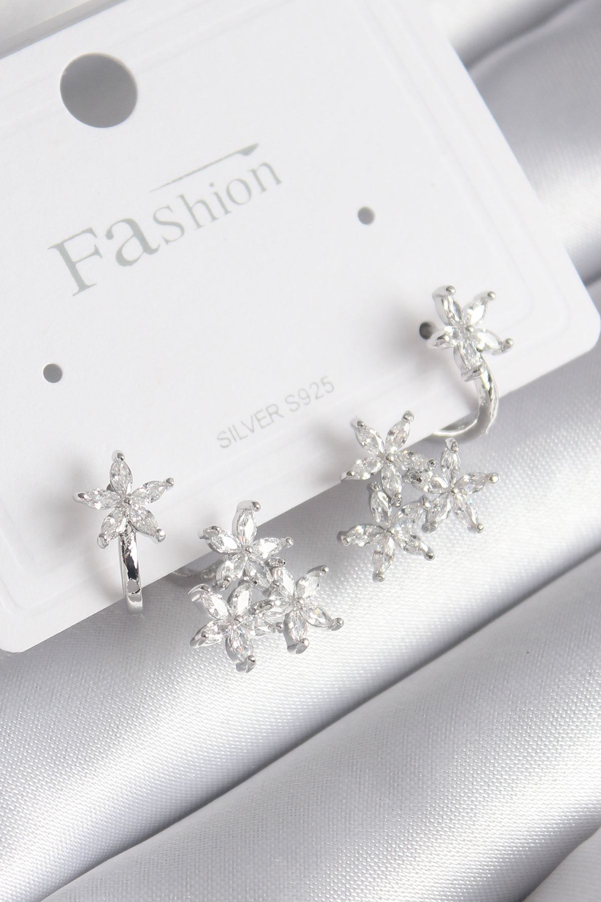 YRTCL Pirinç Gümüş Renk Zirkon Taşlı Çiçek Tasarım Kadın Küpe