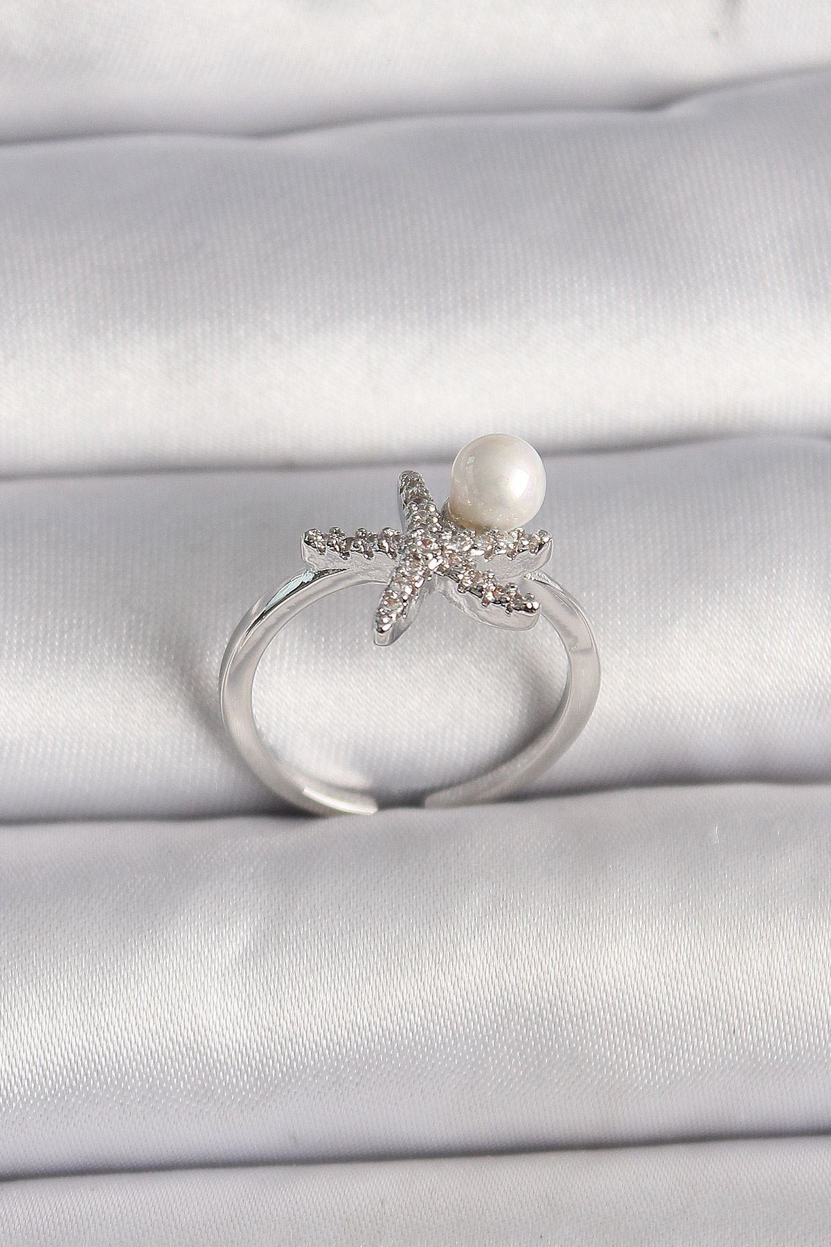 YRTCL Pirinç Gümüş Renk Zirkon Taşlı Deniz Yıldızı Model İnci Detay Ayarlanabilir Yüzük