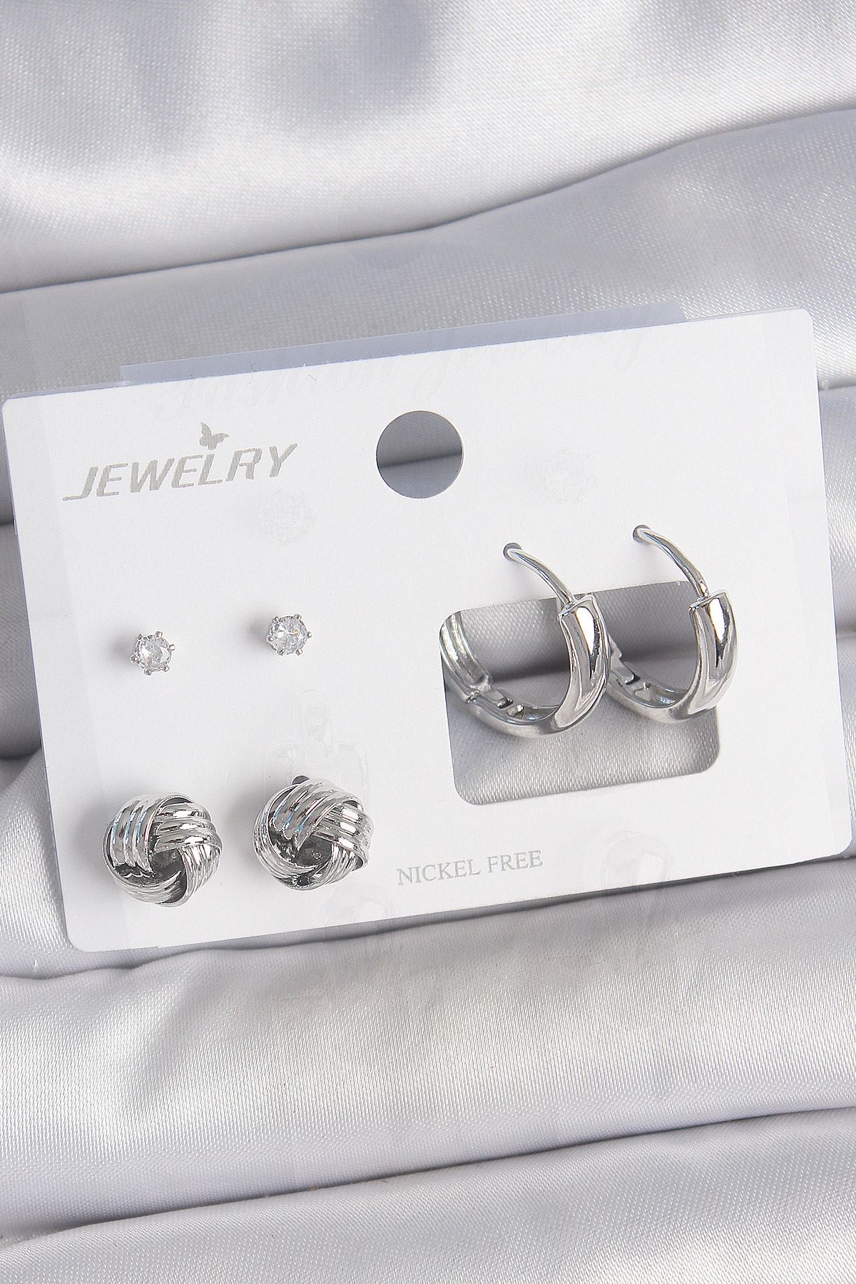 YRTCL Pirinç Gümüş Renk Zirkon Taşlı Halka Model 3 Çift Kadın Küpe Seti