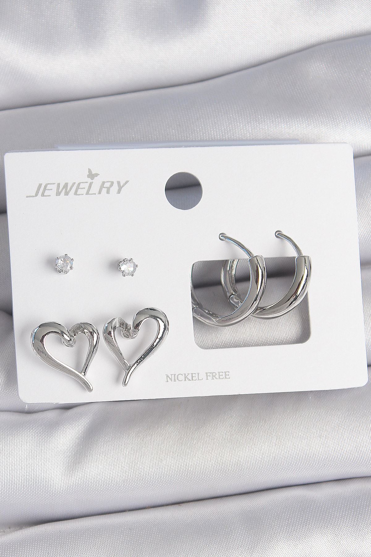 YRTCL Pirinç Gümüş Renk Zirkon Taşlı Halka Model Kalp Detay 3 Çift Kadın Küpe Seti