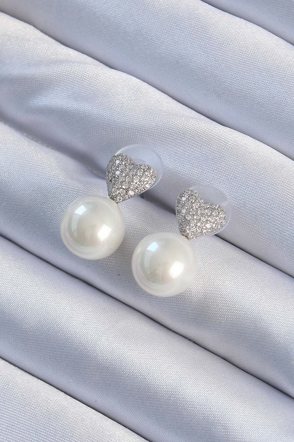 YRTCL Pirinç Gümüş Renk Zirkon Taşlı Kalp Model İnci Tasarım Kadın Küpe