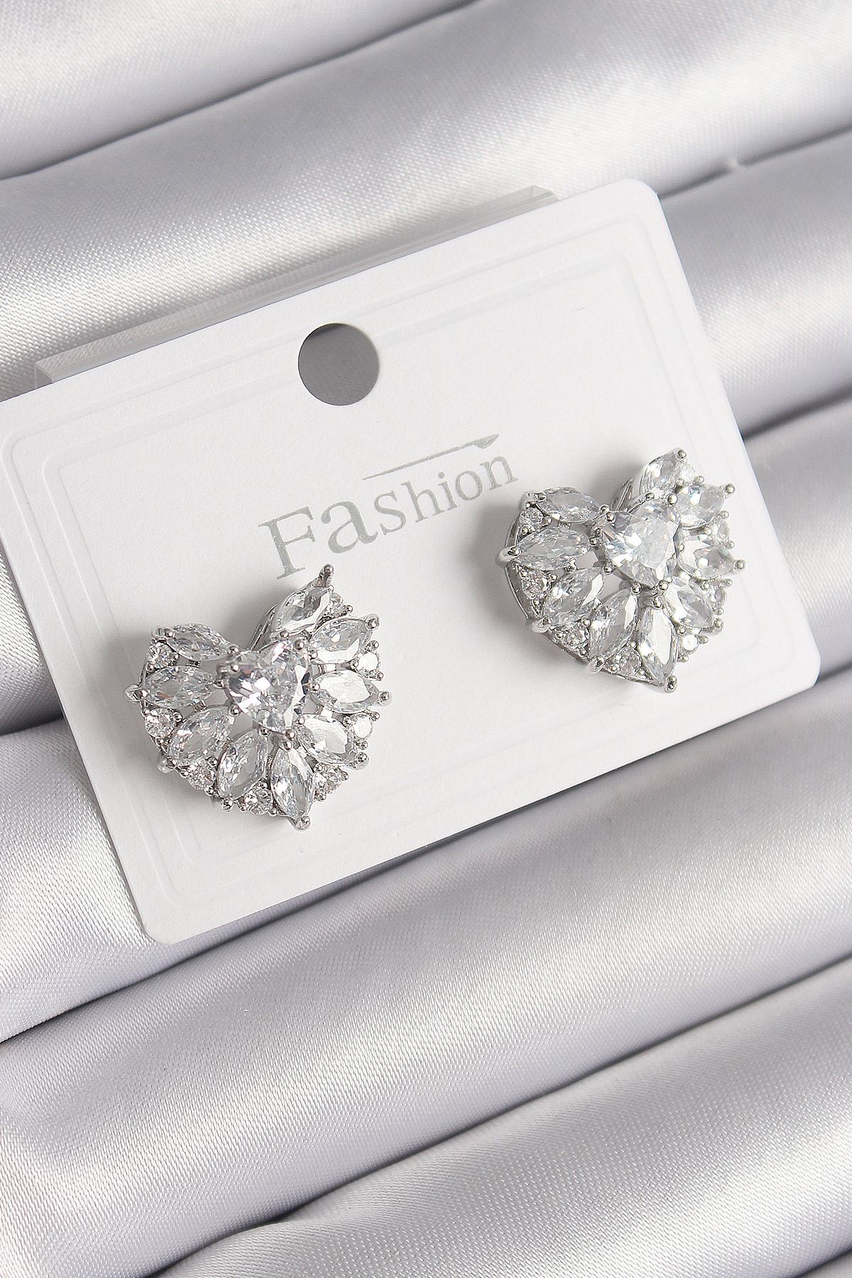 YRTCL Pirinç Gümüş Renk Zirkon Taşlı Kalp Model Kadın Küpe