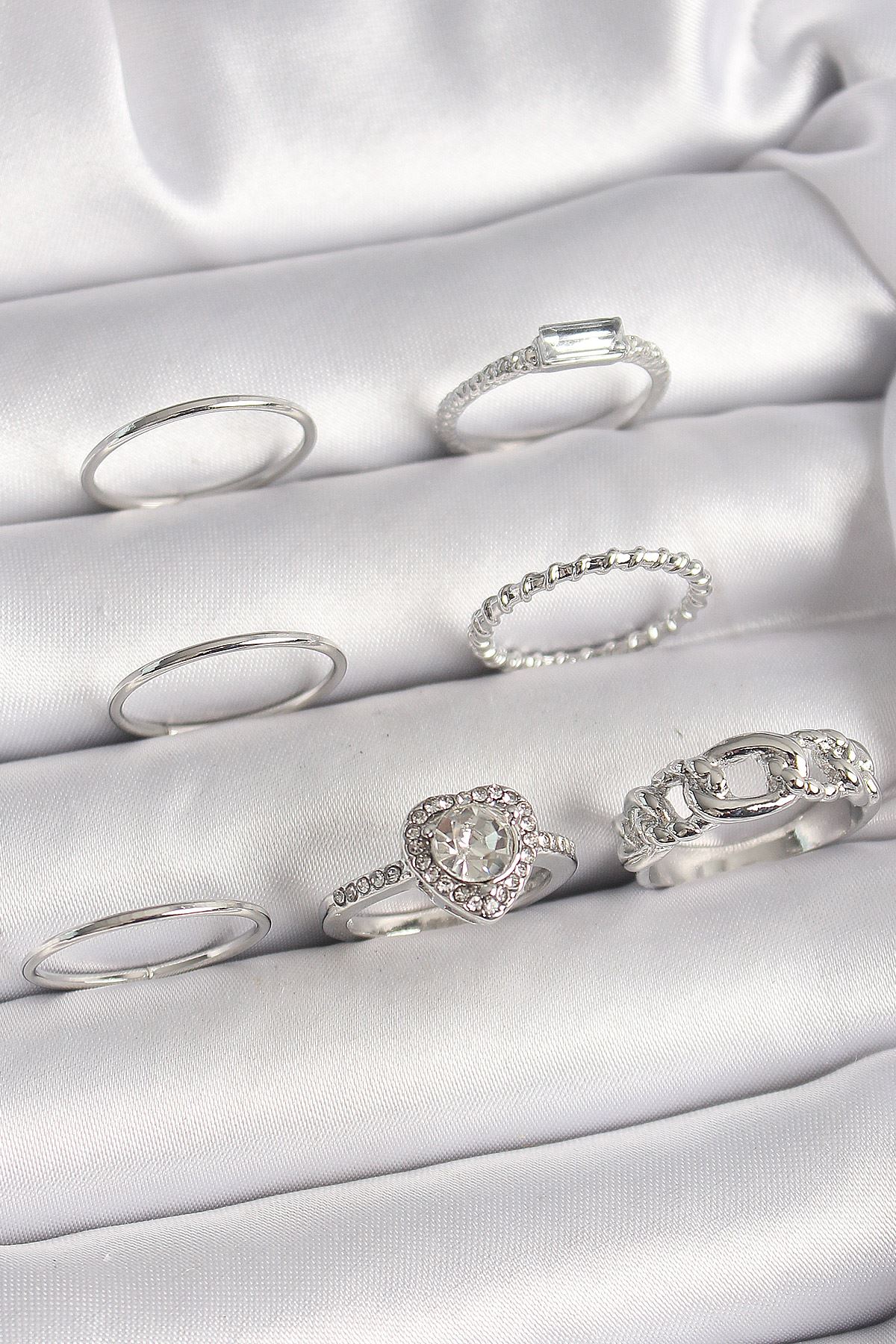 YRTCL Pirinç Gümüş Renk Zirkon Taşlı Kalp Model Kadın Yüzük Kombini