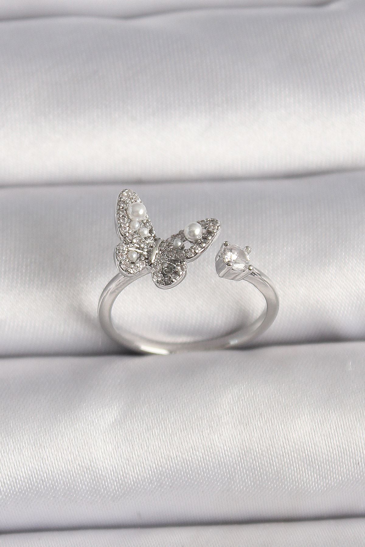 YRTCL Pirinç Gümüş Renk Zirkon Taşlı Kelebek Model İnci Detay Ayarlanabilir Yüzük