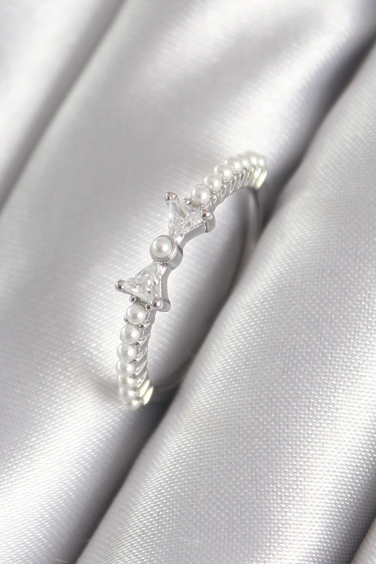 YRTCL Pirinç Gümüş Renk Zirkon Taşlı Kurdele Model İnci Detay Kadın Yüzük