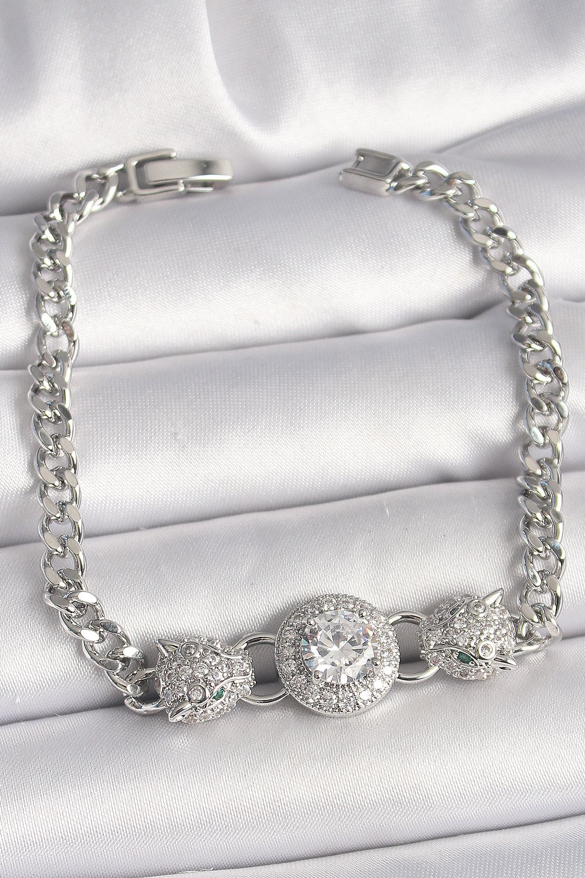 YRTCL Pirinç Gümüş Renk Zirkon Taşlı Leopar Figür Zincir Model Kadın Bileklik