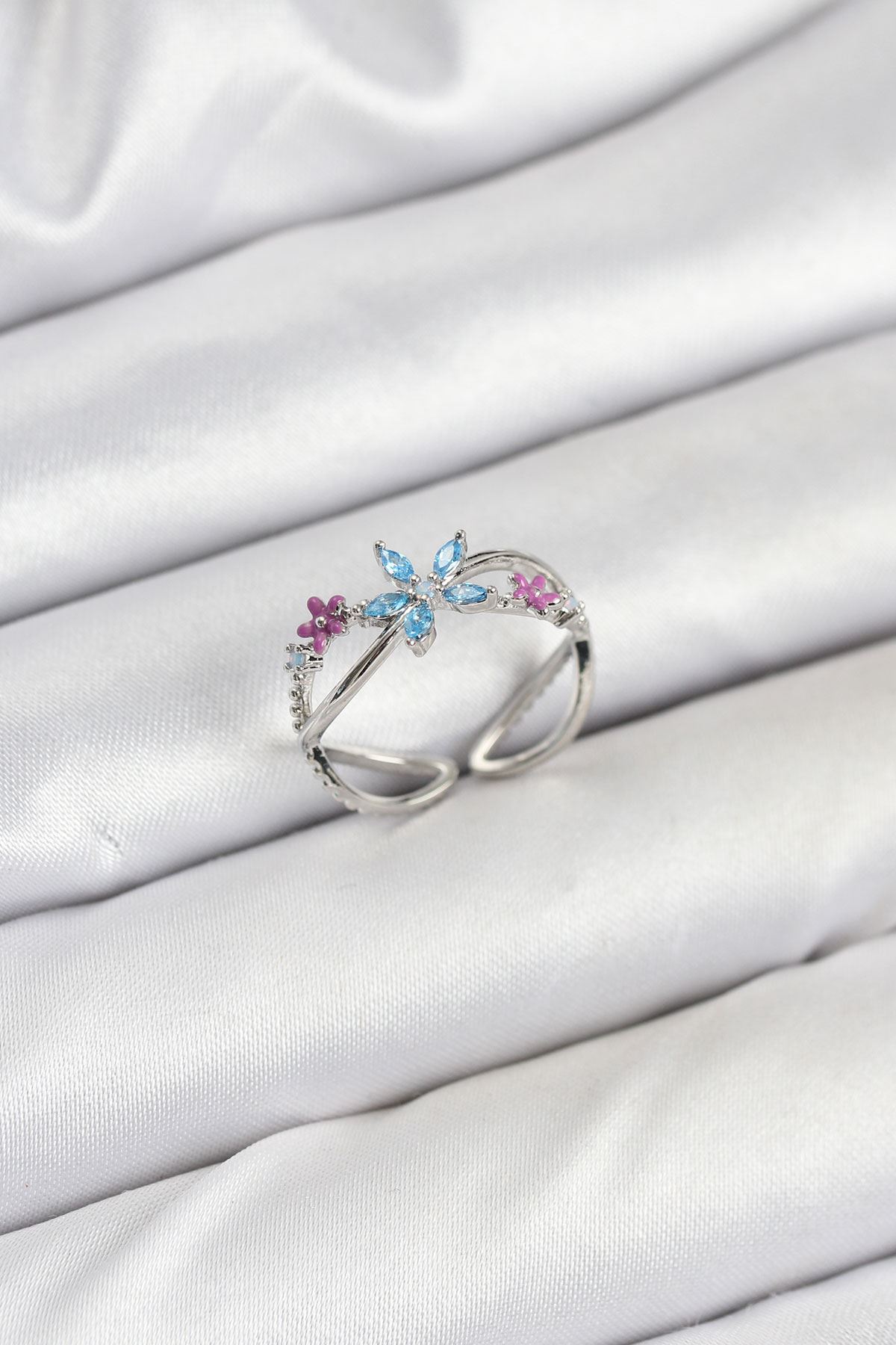 YRTCL Pirinç Gümüş Renk Zirkon Taşlı Mavi Çiçekli Kadın Yüzük