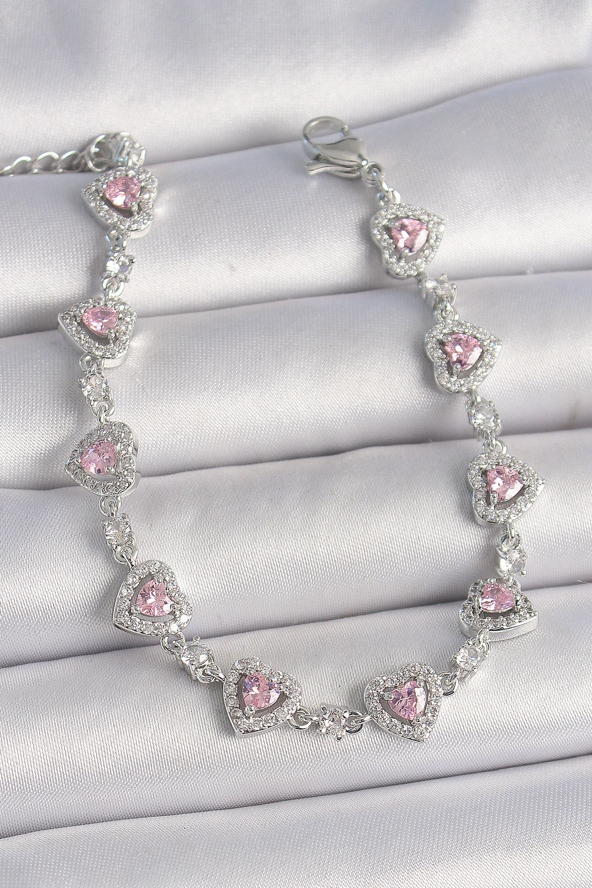 YRTCL Pirinç Gümüş Renk Zirkon Taşlı Pembe Kalp Model VIP Seri Kadın Bileklik