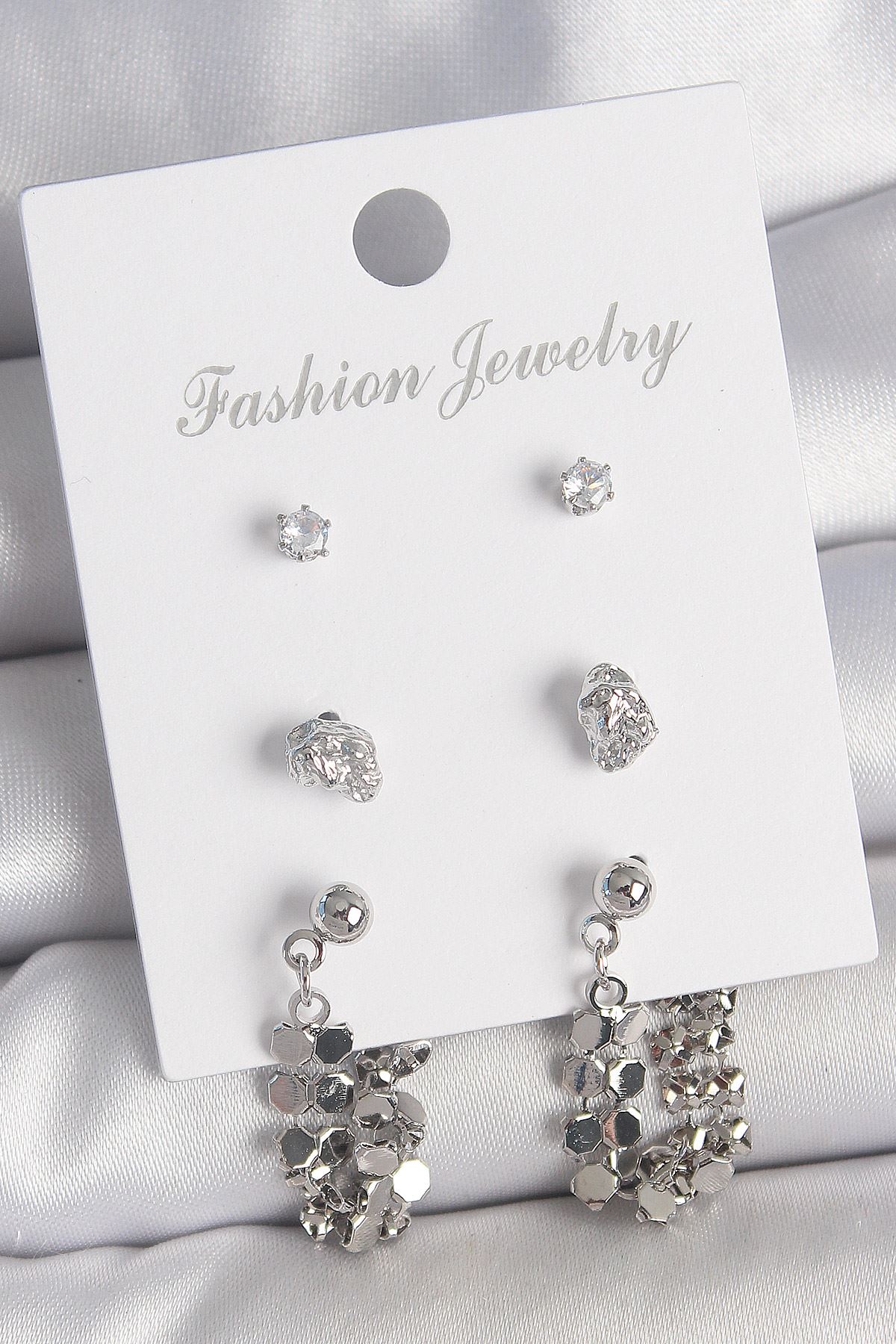 YRTCL Pirinç Gümüş Renk Zirkon Taşlı Pullu Sallantılı Model 3 Çift Kadın Küpe Seti