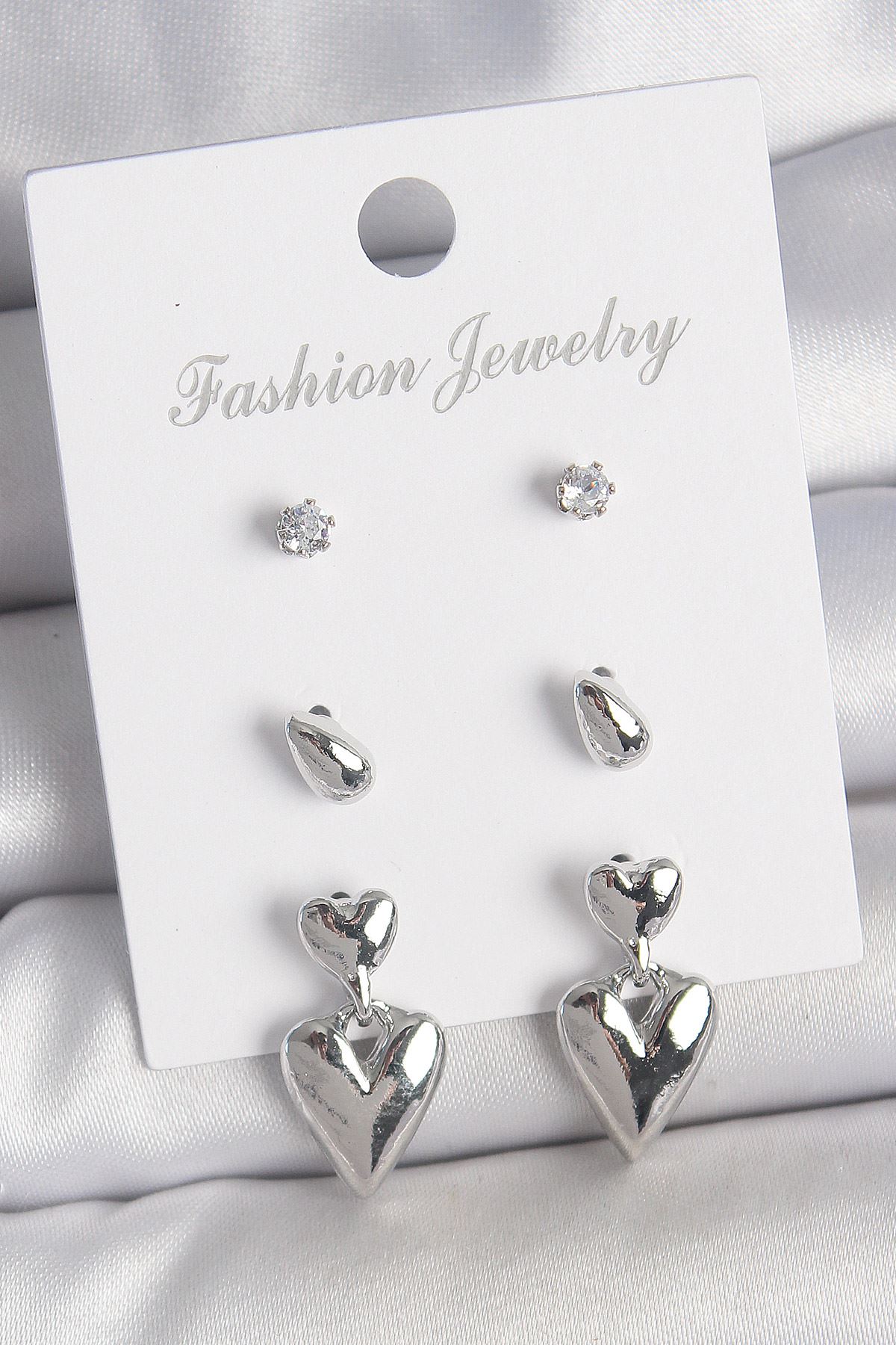 YRTCL Pirinç Gümüş Renk Zirkon Taşlı Sallantılı Kalp Model 3 Çift Kadın Küpe Seti