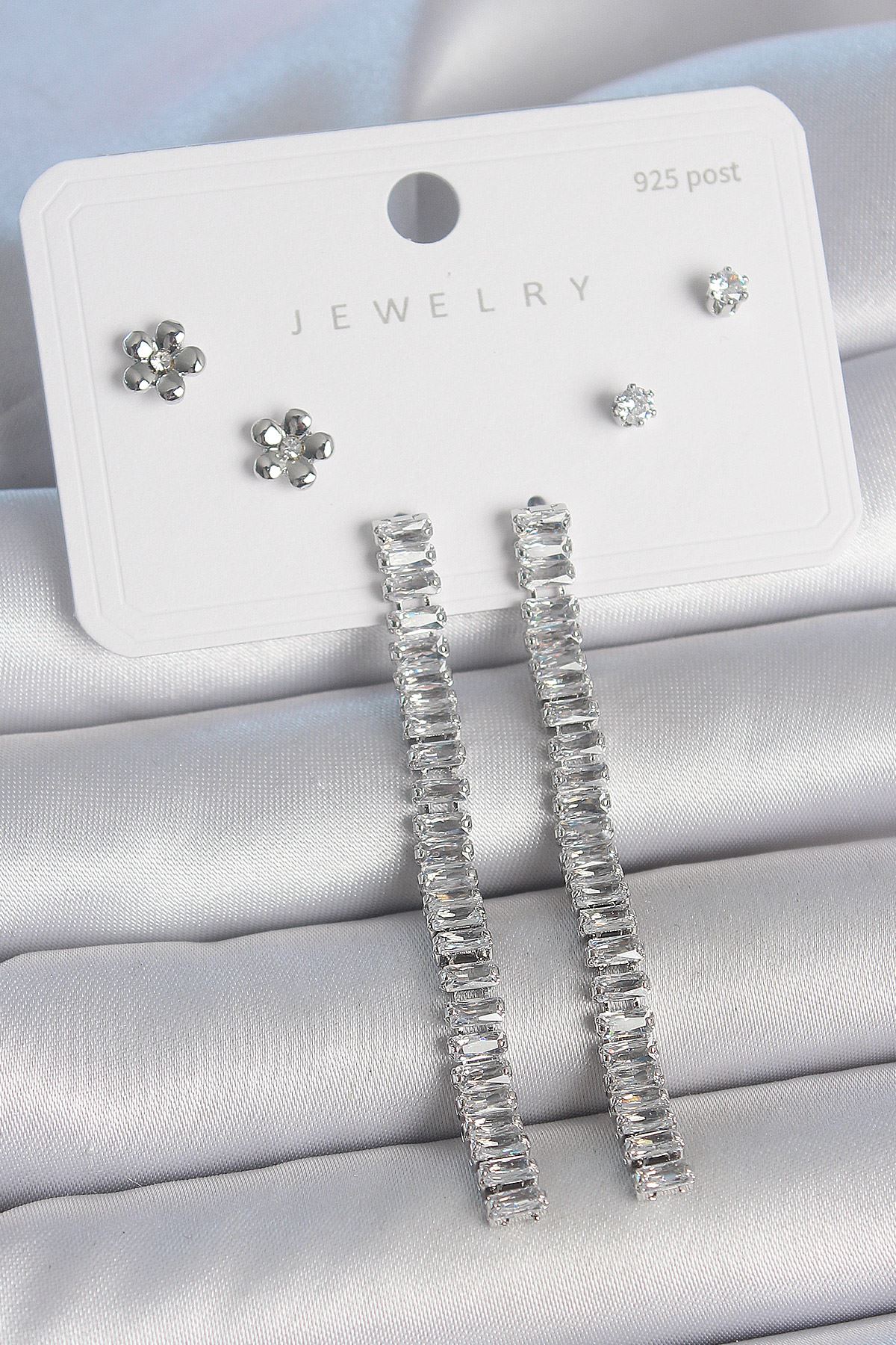 YRTCL Pirinç Gümüş Renk Zirkon Taşlı Su Yolu Model Çiçek Detay 925 Ayar Gümüş Çivi Kadın Küpe Seti