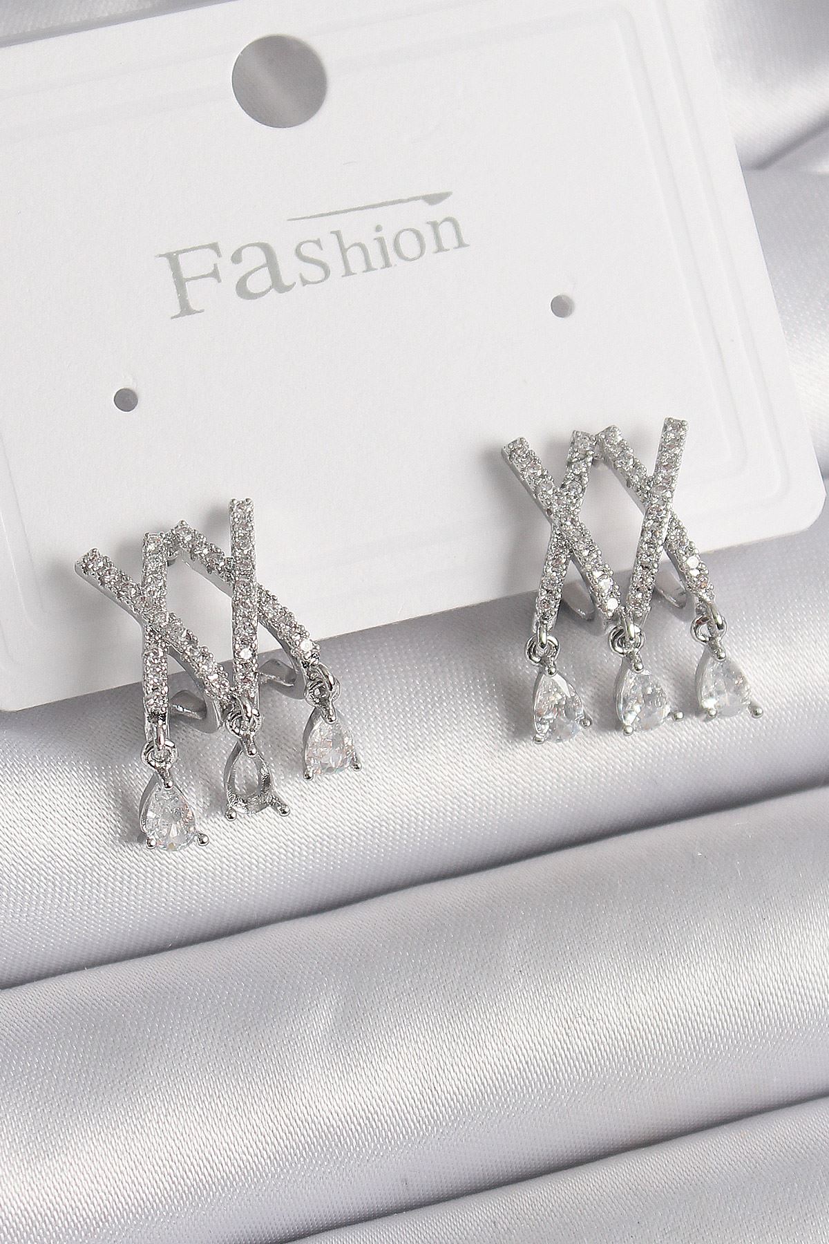 YRTCL Pirinç Gümüş Renk Zirkon Taşlı X Model Sallantı Detay Kadın Küpe